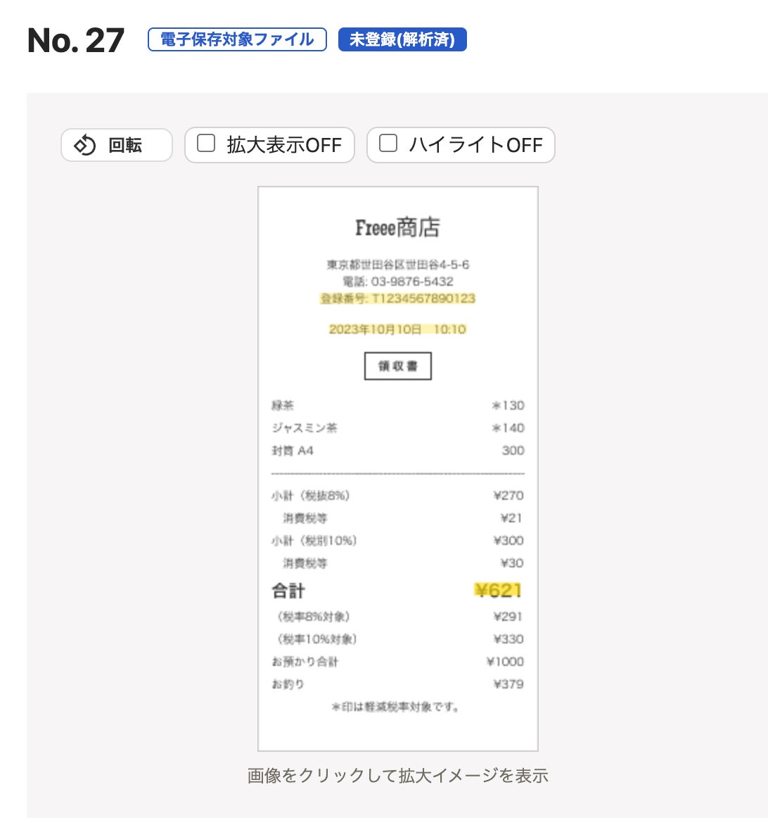freee会計にアップロードされたファイルは、アップロードしたタイミングでAI-OCR解析を行い、日付・金額・インボイス登録番号等の情報を読み取ります。