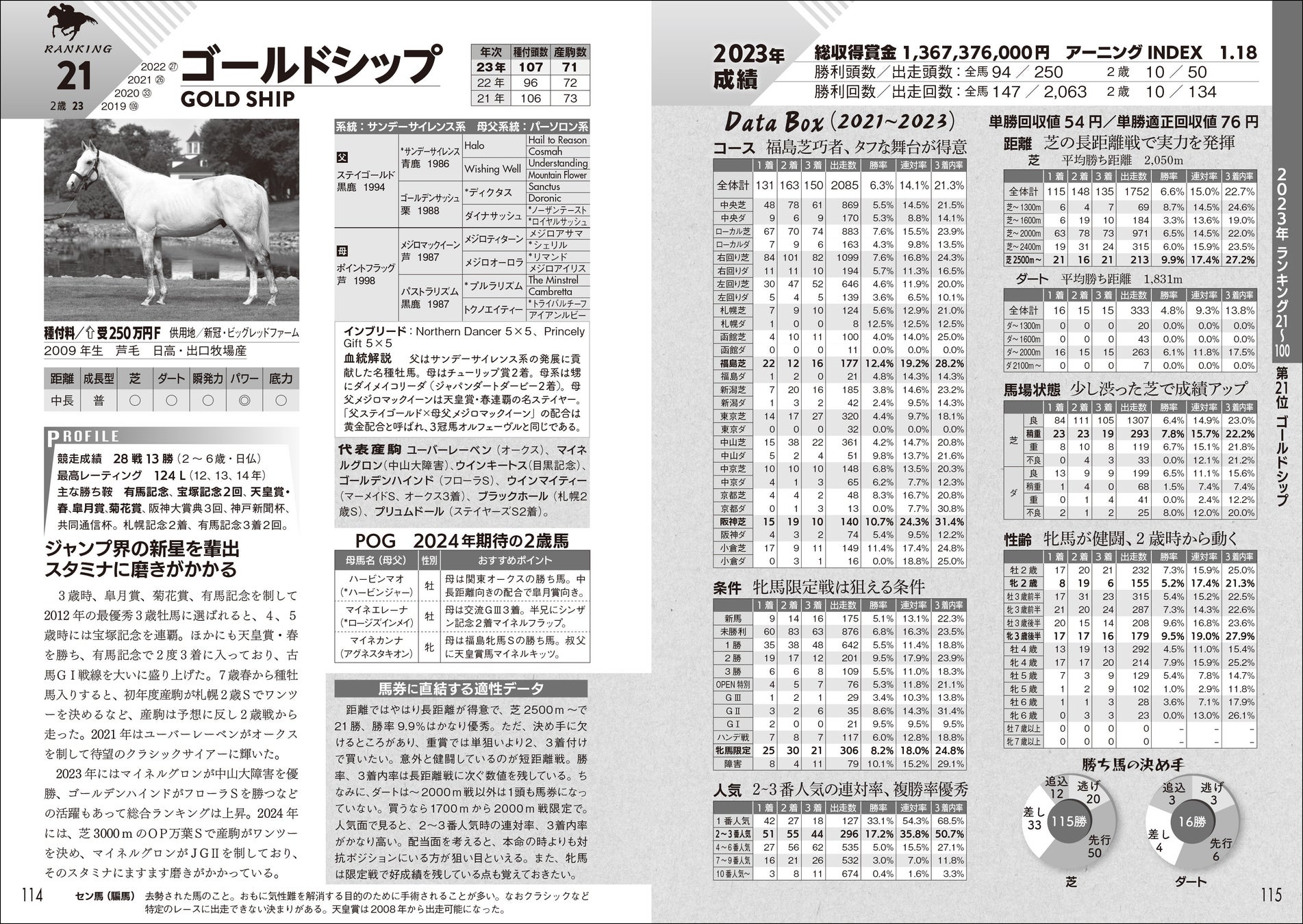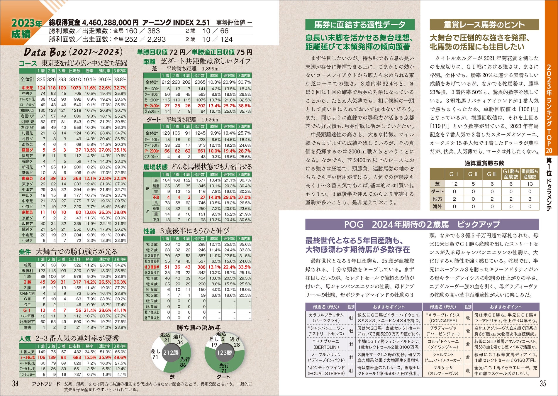コース別や条件別、人気別、距離別、馬場状態別、性齢別の勝率から、芝・ダートの勝利時の脚質、重賞レースでの産駒の傾向、通算重賞勝ち数、データから導き出される馬券購入時のポイントなど、圧倒的な情報と網羅性が特徴です。