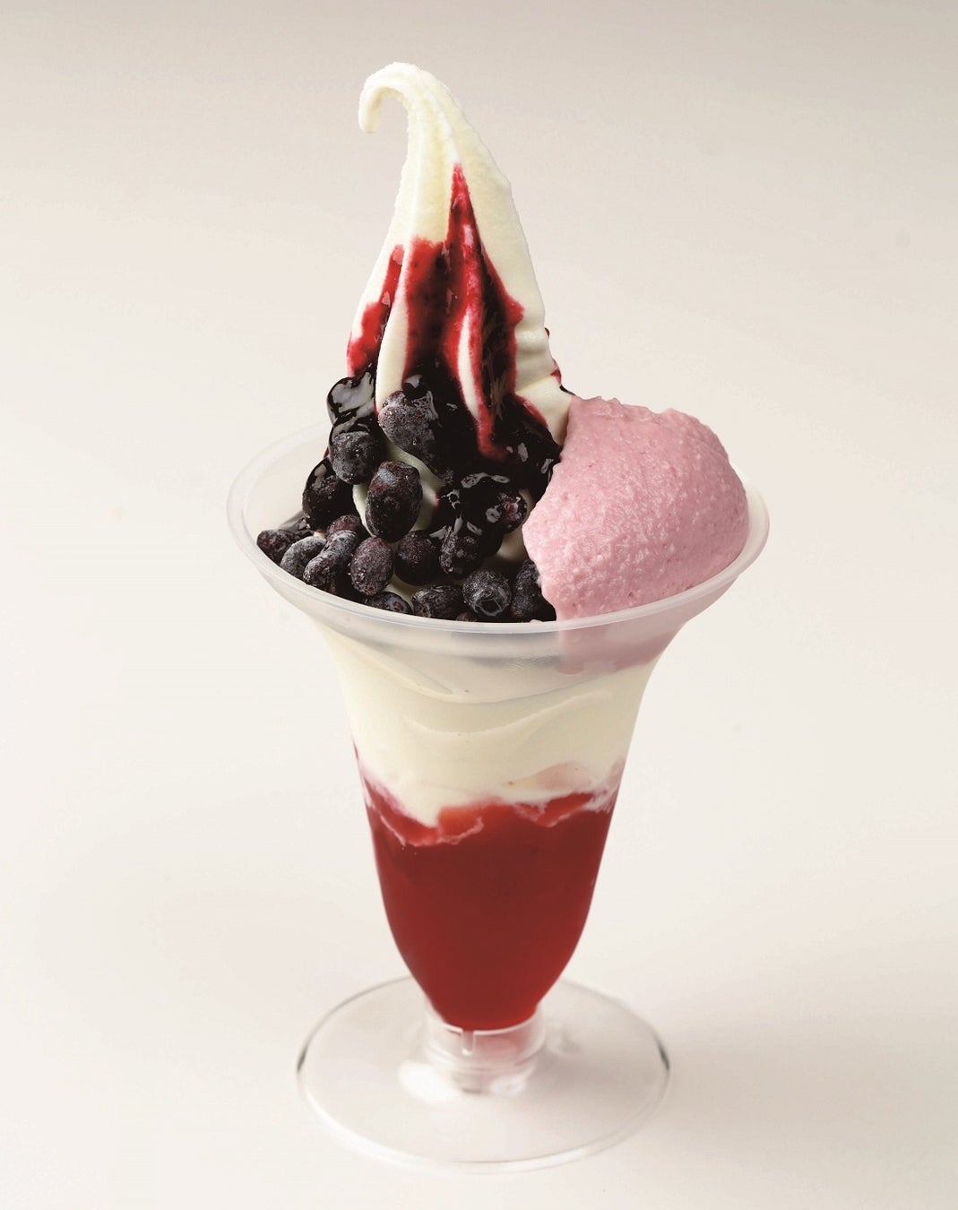 甘酸っぱいハスカップをたっぷりソフトクリームとからめました