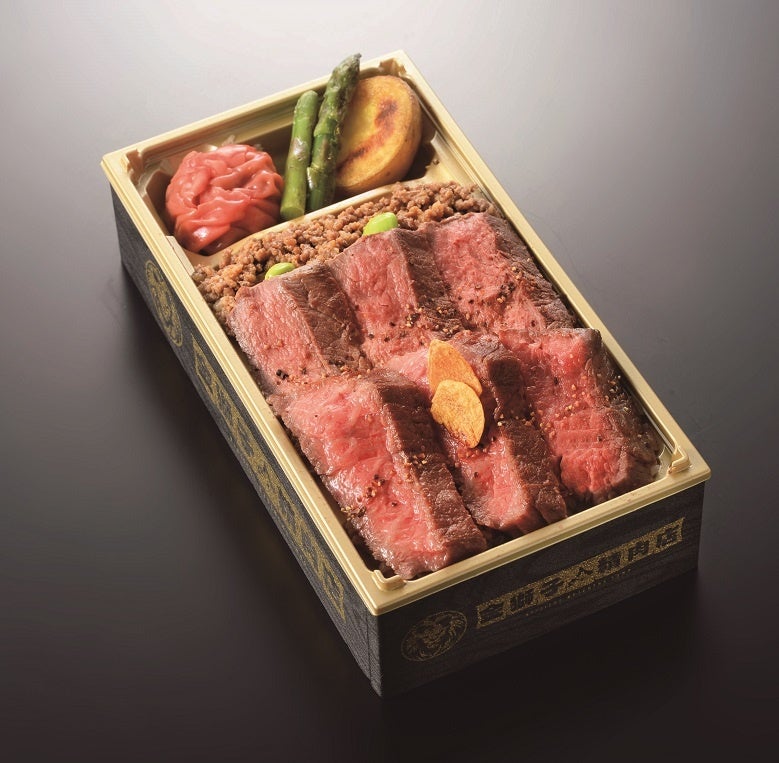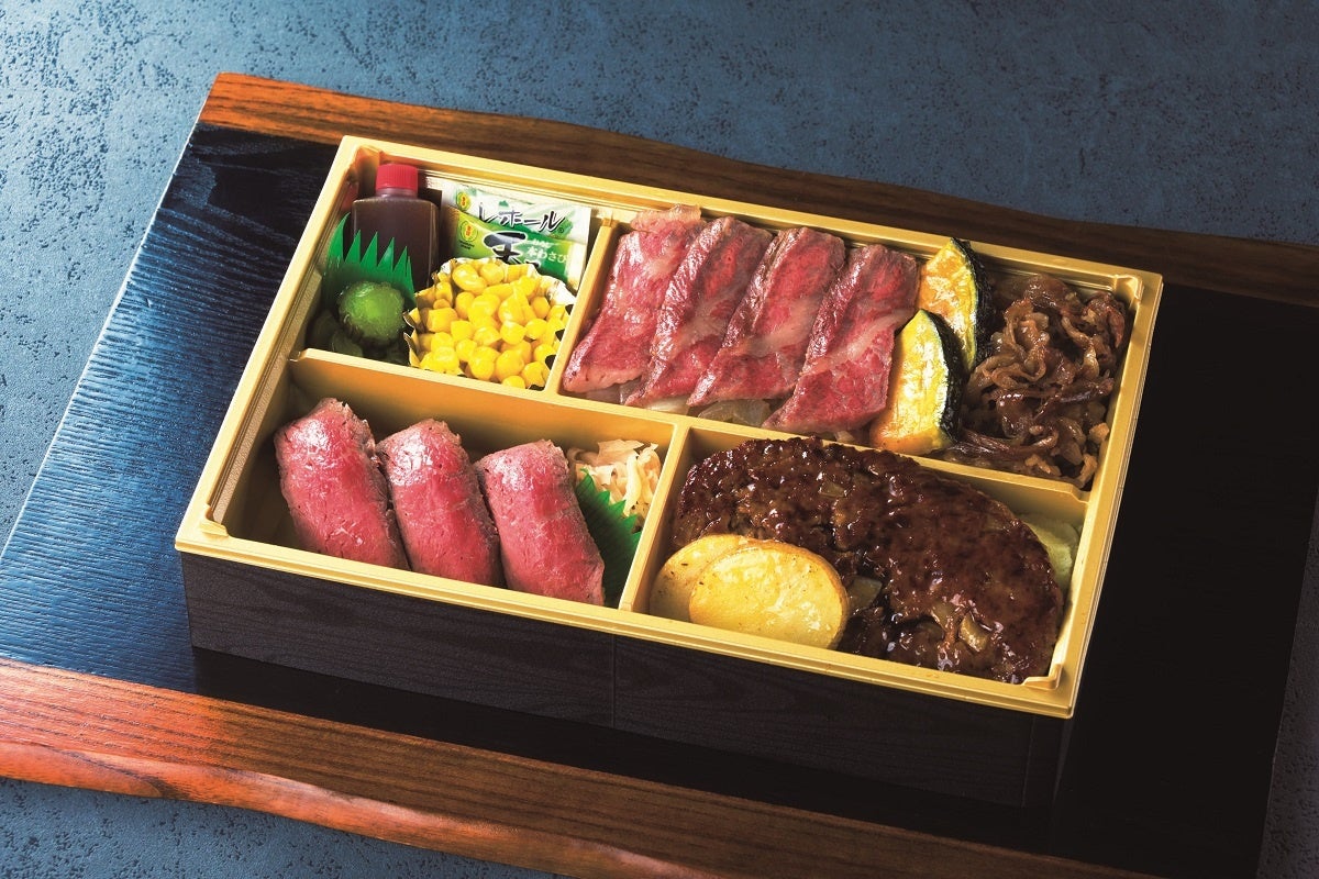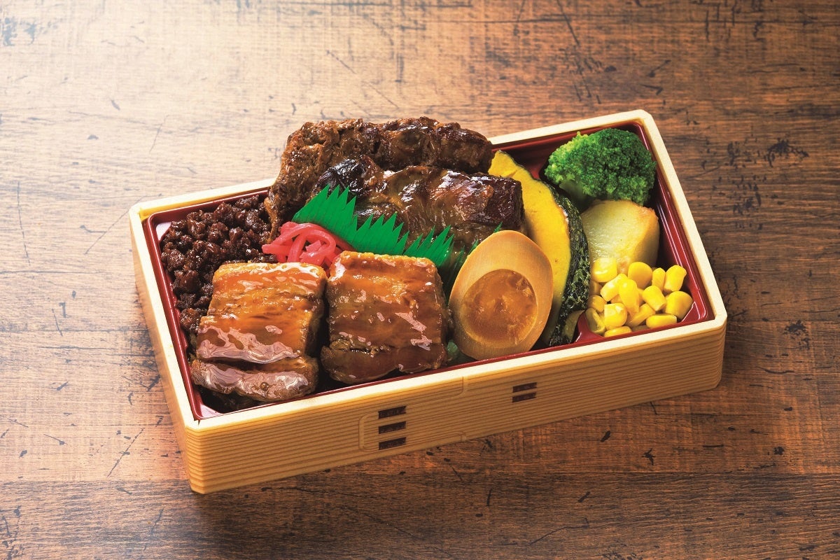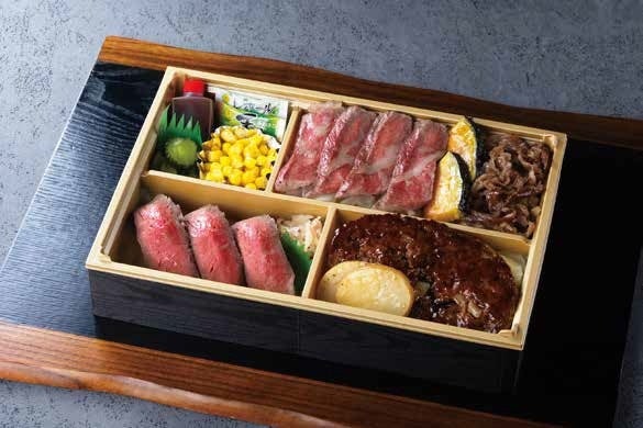 ウエムラ牧場で生産される白老牛「上村和牛」をサーロインステーキやハンバーグ、香味焼き、赤身ステーキすしで味わう贅沢弁当。店頭で肉を焼き上げる様子や匂いに食欲がそそられます