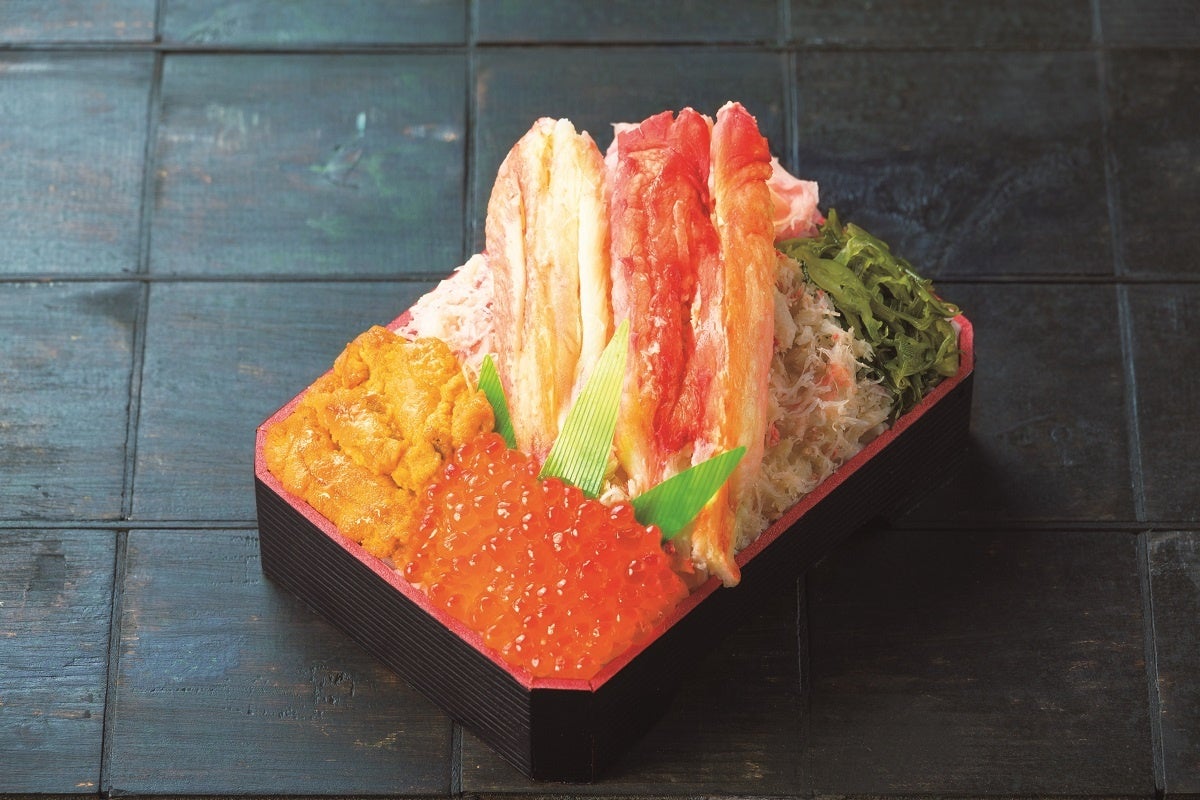 カニの棒肉、ほぐし身と、うに、いくらをこんもりと盛り付けたカニ好きにはたまらない弁当