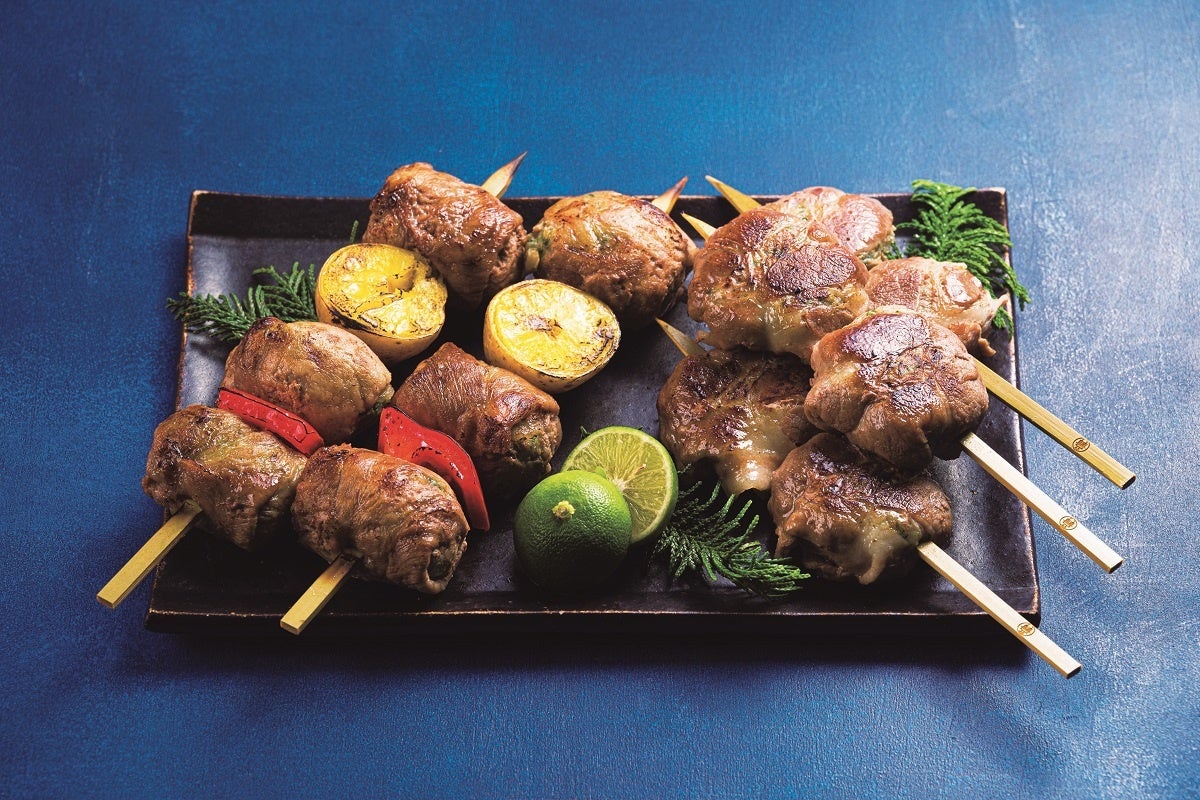 十豚巻き串(①野菜・②北海道産ホタテ貝柱、1本)各756円 西武池袋本店限定