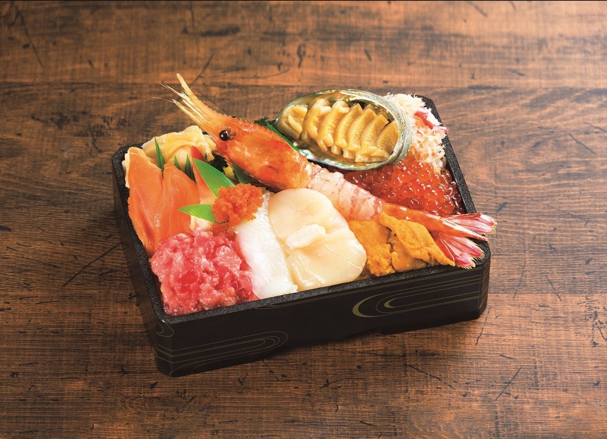 サーモン・マグロ・イカ・ホタテ・シシャモ卵・ホッキ・ウニ・ボタン海老・イクラ、アワビ・カニの11種を盛りつけた贅沢弁当