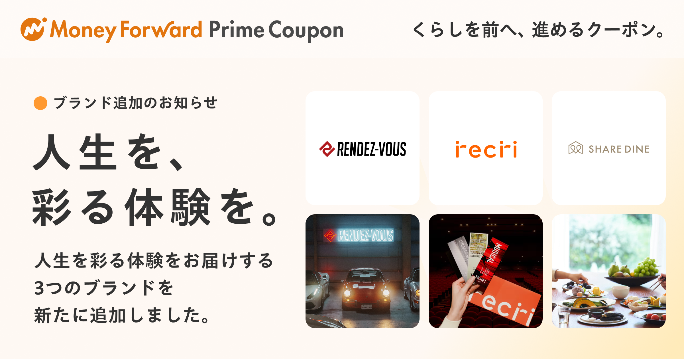 『マネーフォワード ME』プレミアム会員向け「Prime Coupon」、「人生を、彩る体験を。」をテーマに新たに3つの提携ブランドを追加