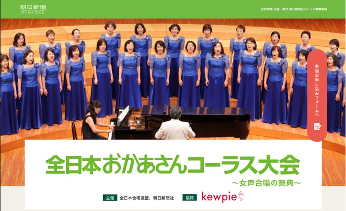 株式会社朝日新聞社(代表取締役社長:中村史郎)は、一般社団法人全日本合唱連盟(理事長:長谷川冴子)とともに主催する全日本おかあさんコーラス大会(協賛:キユーピー株式会社)の魅力を紹介する新しい特設サイトを26日に公開しました。https://www.asahi.com/ads/chorus_mothers/