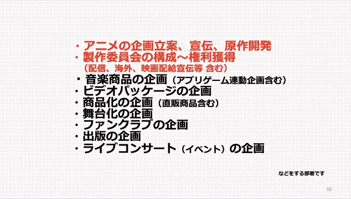 そして、「まずはアニメビジネスがどういう世界なのかをお話しします。ここを客観的に見ておくことが大切だと思っています」と資料をもとにアニメ産業市場のここ数年の規模や傾向などを伊藤なりの視点で説明。「では、僕らの部署がどんな仕事をしているのかというと、アニメの企画立案、宣伝、原作開発。製作委員会の構成から権利獲得。そのほかにも、音楽商品、グッズ、舞台化、ファンクラブなど、簡単に言うとアニメにまつわる企画をして運営をしています」と紹介していきます。