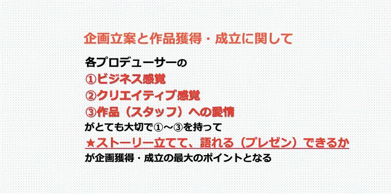 そして、制作プロデューサーの仕事を紹介。「プロジェクト(作品)のコスト(製作費・市場)、クオリティー(質・スケジュール)、スタッフ(監督・キャストなど)を管理して、作品を世の中に送り出す仕事です。マネージメント能力が問われるかなと思います」とのこと。続けて、実際に伊藤が作成した企画書をもとに企画立案についても話してくれました。企画立案と作品獲得・成立するにあたり、制作プロデューサーとして何が大切かというと「ビジネス感覚、クリエイティブ感覚、作品(スタッフ)への愛情がとても大切。それらを持って、ストーリー立ててプレゼンできるか、“相手になるほど!”と思ってもらえるのがポイントです」と力説していきます。
