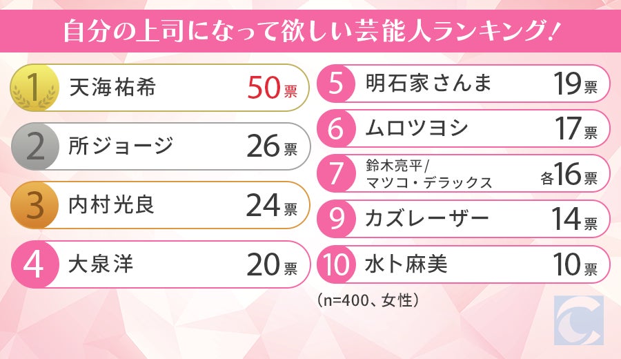 そこで今回は全国の女性400名を対象に「自分の上司になって欲しい芸能人」についてのアンケートをおこないました。