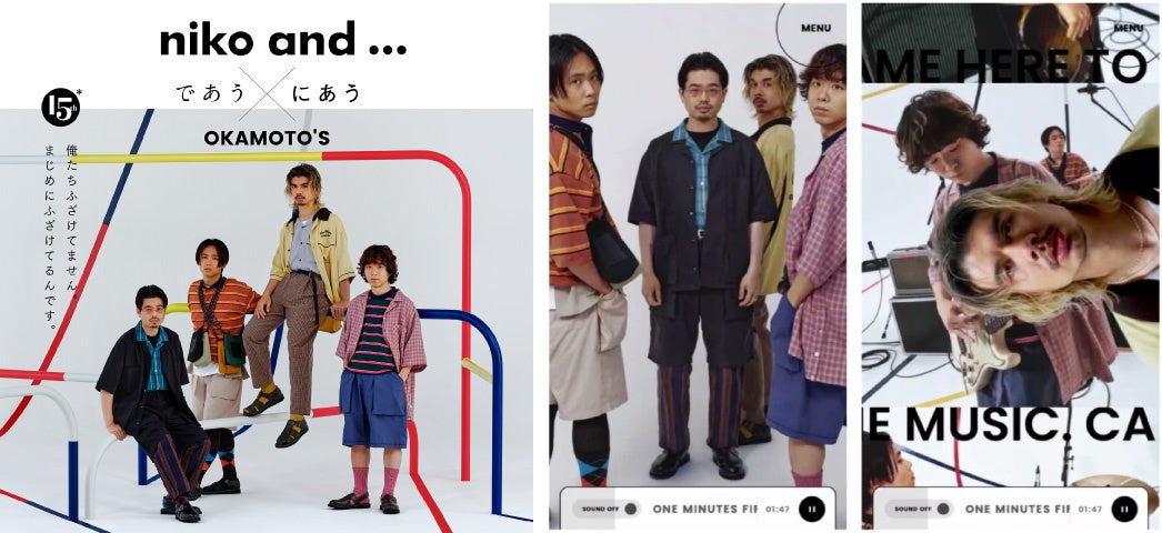 第二弾である今回は、大人になっても変わらない“少年ごころ”を感じさせるバンド・OKAMOTO'Sを起用。「俺たちふざけてません。まじめにふざけてるんです。」というテーマのもと、「即興音楽実験」と題し、OKAMOTO'Sが撮影現場でセッションしながら即興で制作した楽曲のミュージックビデオを制作しました。縦スクロール型の特設サイトでは、「niko and ...」のファッションを纏いお茶目なポージングを披露するOKAMOTO'Sの姿や、即興で出来上がった楽曲を演奏するメンバーが次々と流れてきます。公園で遊ぶ少年たちのように、のびのびと音楽を楽しむOKAMOTO'Sと、「niko and ...」の魅力が掛け合わさって生まれた作品を通して、新しいファッションの魅力をお伝えします。
