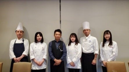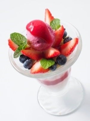 旬のイチゴ、イチゴムース、チョコレートクランチ、ベリーシャーベットを使用。学生さんの作品の特徴的な食感は活かしつつ、提供しやすいパフェスタイルに!