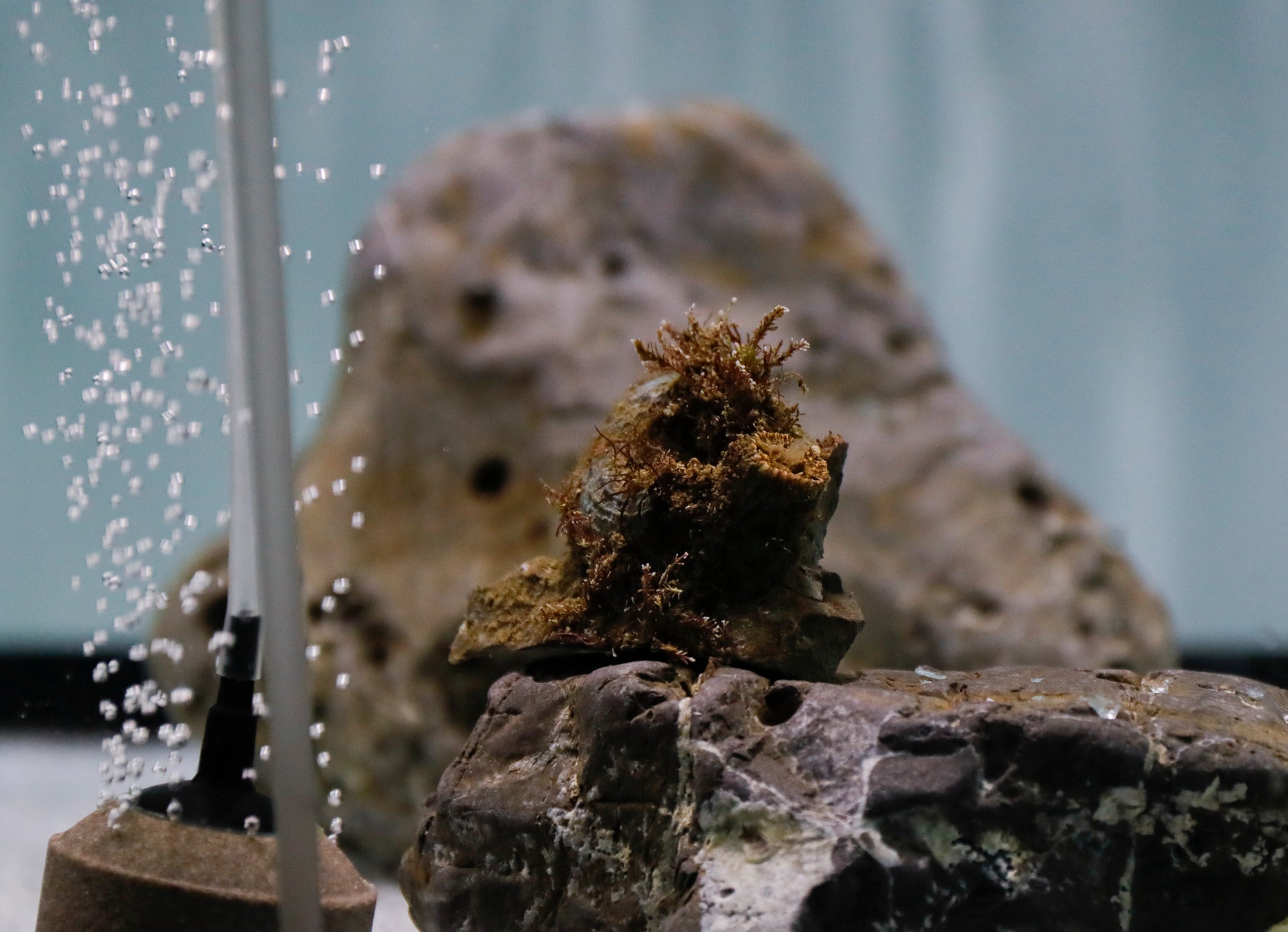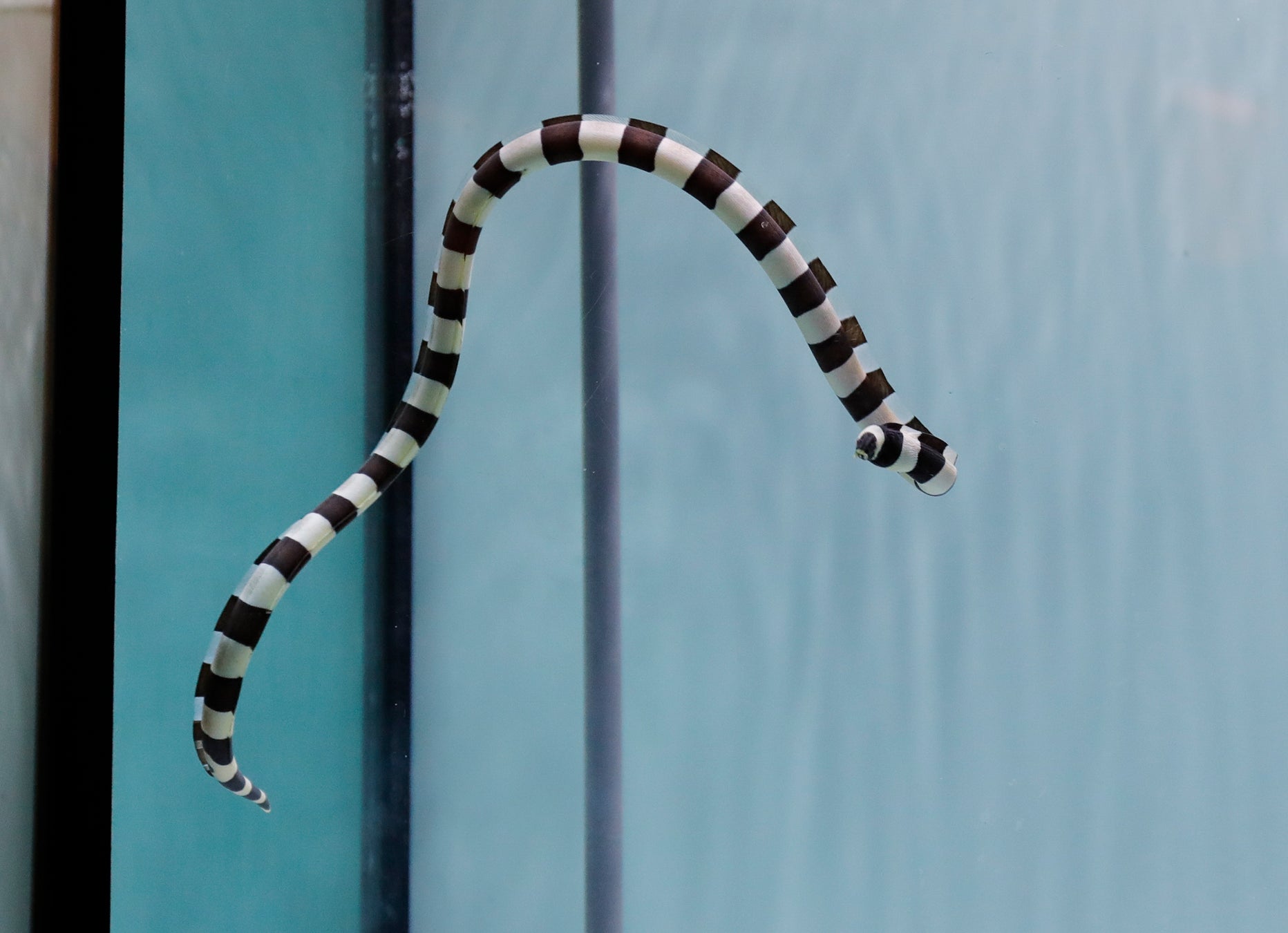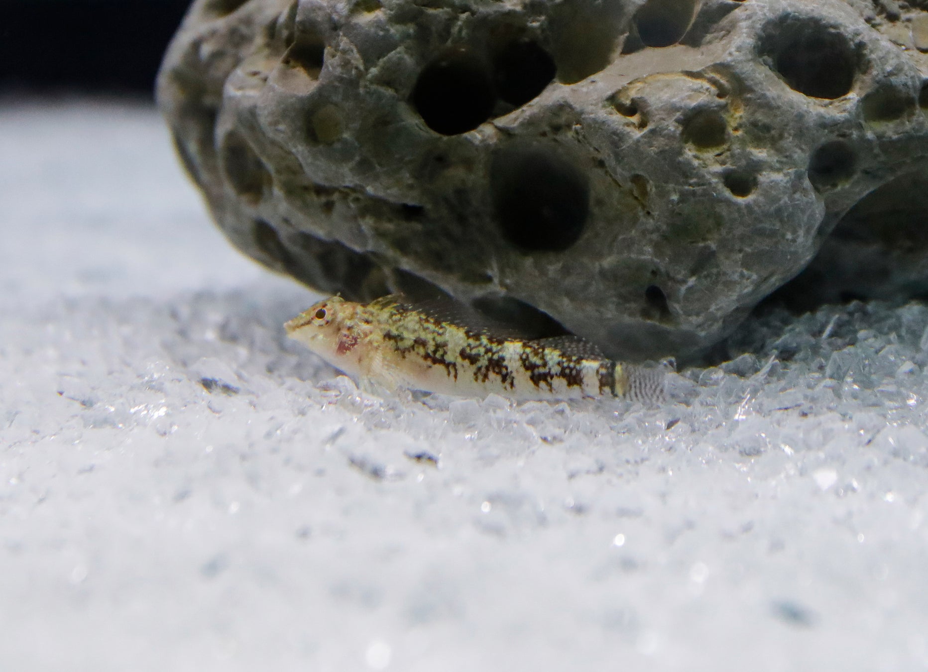 展示生物は、来年の干支・巳(ヘビ)にちなむ名前がついた海の生き物で、巻貝の仲間のオオヘビガイや潮だまりや浅い岩礁域に生息でみられるヘビギンポ、「は虫類」ではなく魚の仲間であるシマウミヘビの3種を観察できます。特に白黒の縞模様が特ちょうのシマウミヘビは、初めて見るお客様も多く「チンアナチゴ?」と首を傾げながら覗き込み、ウミヘビだと気づいて驚く姿が印象的です。