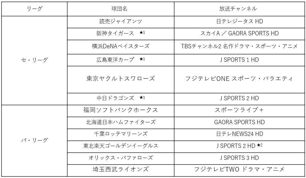 ★1 対読売ジャイアンツ戦については、放送チャンネルが異なる場合があります。
