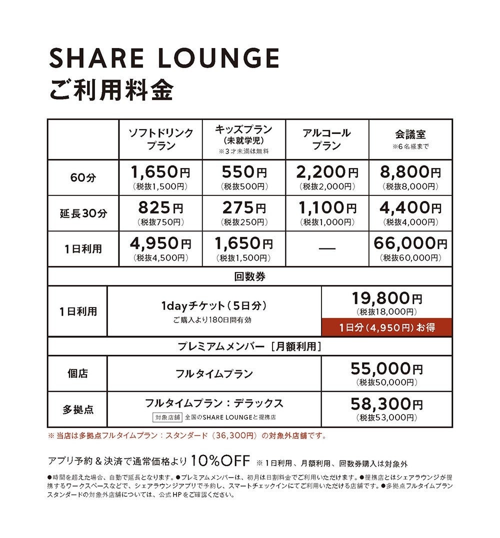 ※SHARE LOUNGEアプリで予約・決済いただくと、さらに10%オフ