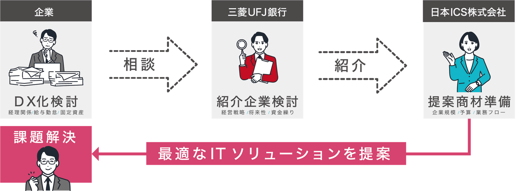 2022年5月19日に、株式会社三菱UFJ銀行、凸版印刷株式会社※、トッパン・フォームズ株式会社※、TIS株式会社、株式会社アグレックスの5社の業務提携契約により立ち上げを行った、DXに関する最適なソリューションを提供するスキームです。業務プロセスの変革、BPOの構築・運用、システム開発をはじめとする専門商品・サービスの中から最適なソリューションを見いだし、DXの戦略策定から商品・サービスの導入までを一気通貫で支援します。