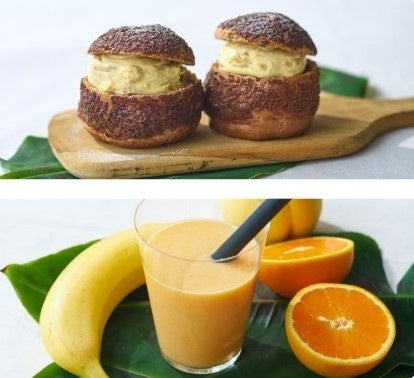 “日本では栽培が珍しい作物を育てたい”という思いから生まれた「こくぼ農園」の蜜の月バナナ。 栽培期間中は農薬不使用のため皮ごとおいしく食べられ 、糖度の高さと芳醇な香りが評判の高級バナナです。このバナナで新しいスイーツを、と5月にプロジェクトがスタート。フルーツ生産者の想いをスイーツにして届ける「KiiKa」を立ち上げたパティシエ・山野裕代さんの協力もあり、学生のアイデアをもとにできあがったのがバナナのシュークリーム 。クリームにバナナのざく切りを加えており、ちょうどいい甘さと香りが口の中に広がります。蜜の月バナナの味を多くの方に知ってもらいたいという農園の願いも叶えられました。また和歌山県産フルーツ(蜜の月バナナ・オレンジ・桃)をふんだんに使ったミックスジュースもご用意しました。