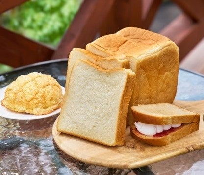 右から)生クリームサンド(1個)200円 角食(1斤)331円 BIGメロンパン(1個)250円