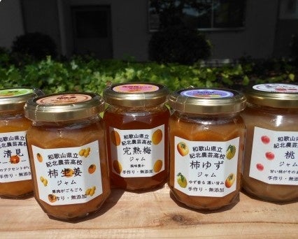 紀州南高梅やあら川の桃、富有柿など、果樹王国ならではの地元産素材を使用。食品製造を学ぶ高校生たちによる手作りのジャムとマーマレードです。
