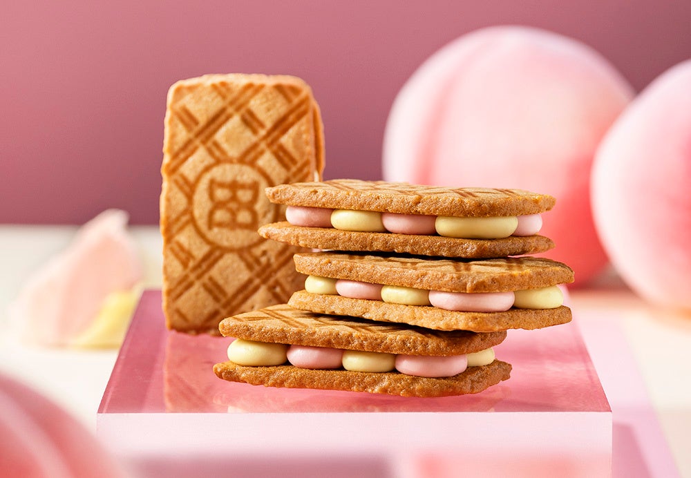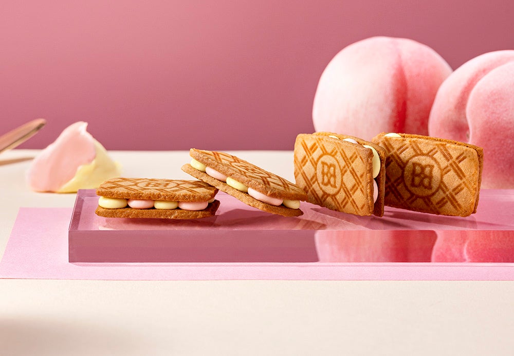 ミルキーでなめらかなくちどけの定番“バターホイップショコラ”に、国産白桃の果汁感あふれる“白桃ホイップショコラ”。とろける2味のショコラをぷっくりと交互に絞りました。サクサクッと軽やかなバターサブレでサンドすれば、夏に食べたい爽やかショコラサンドのできあがり。白桃とバターのマリアージュがたまらない、いまだけの美味しさをお楽しみください。
