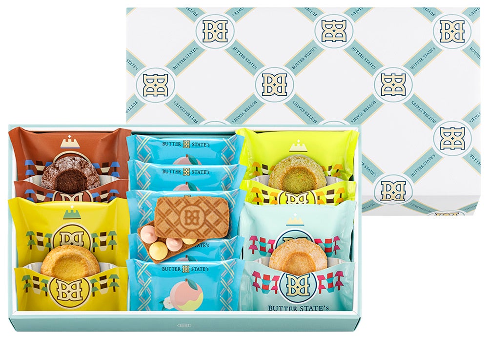 定番から夏限定『レモンバター』まで4味が楽しめるバターステイツクッキーに、白桃バター&香るバターのとろけるバターホイップショコラをバターサブレでサンドした『白桃バターホイップサンド』が楽しめる詰合せ。