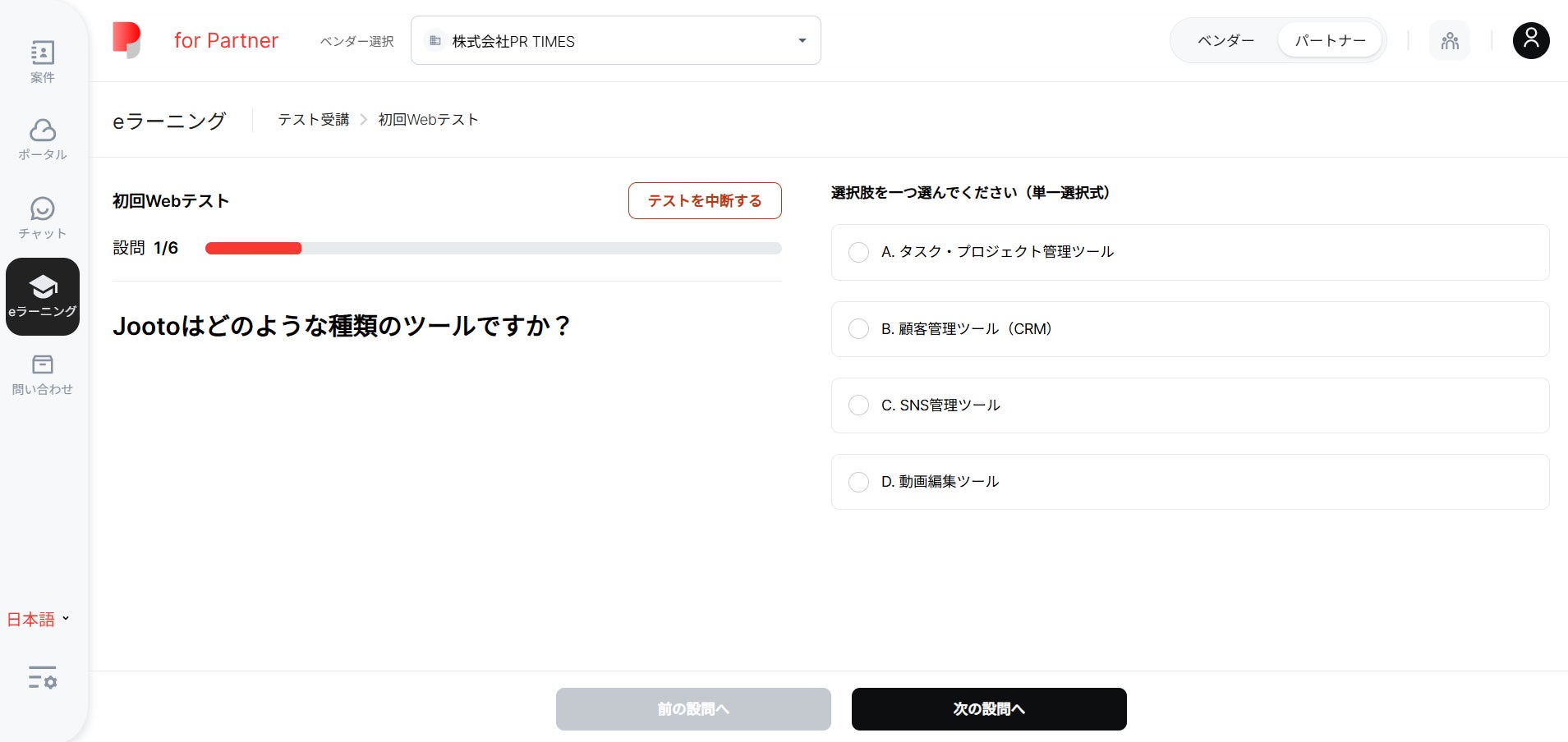 ポータルサイト内でJootoの機能や活用方法に関する基礎知識を習得できるeラーニングを実施し、提案力向上を支援します。eラーニング受講後はWebテストをおこない提案に必要な知識が取得できたかを確認します。細かい疑問点など必要に応じて、Jootoスタッフよりフォローも実施します。