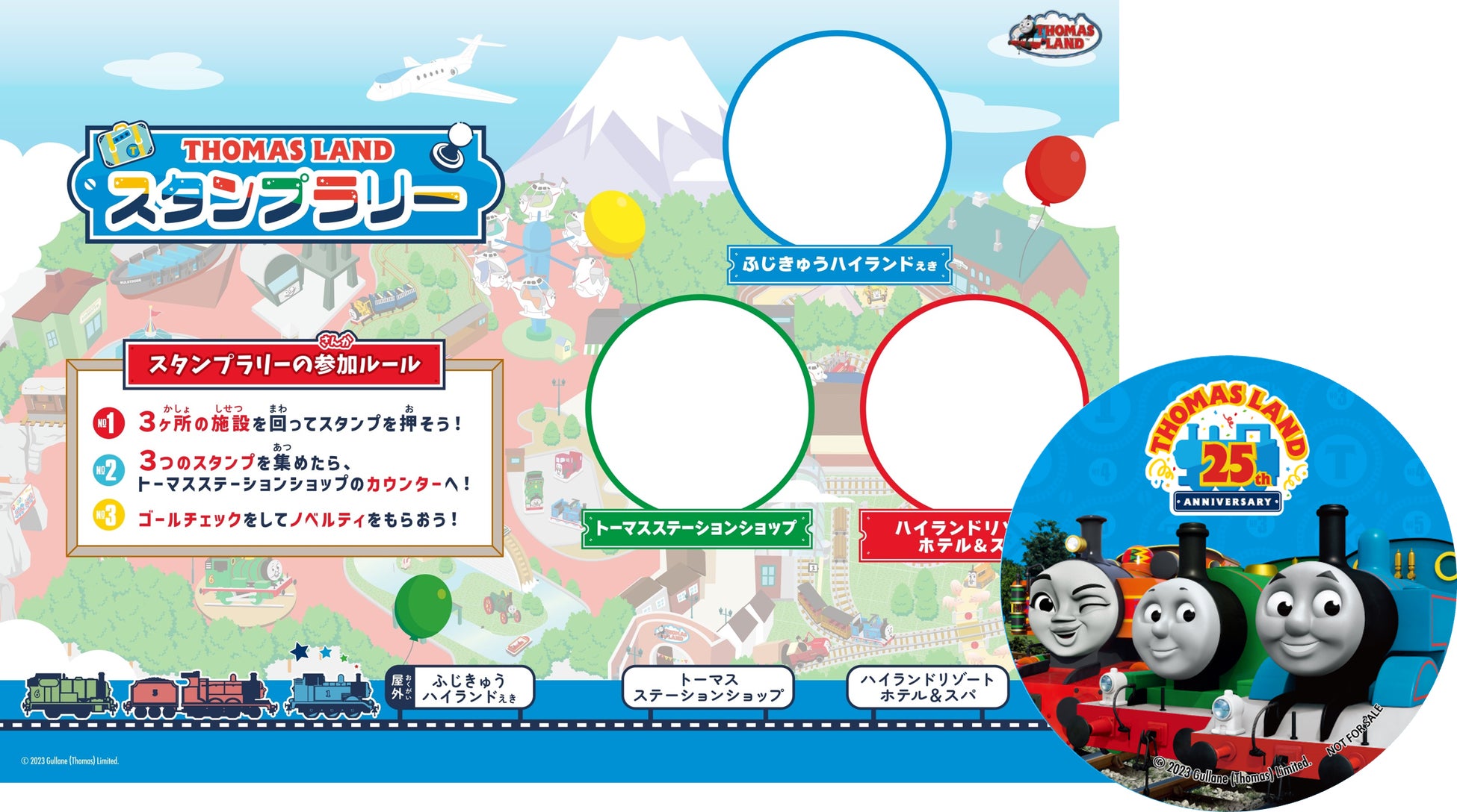 トーマスランドのトーマスステーションショップ、富士急行線の富士急ハイランド駅、ハイランドリゾート ホテル&スパのロビーの3施設を巡って、トーマス・パーシー・ニアのスタンプを集めてまわる周遊スタンプラリーを開催中。全て集められたお子さまにはもれなく、25周年記念缶バッジをプレゼントいたします。