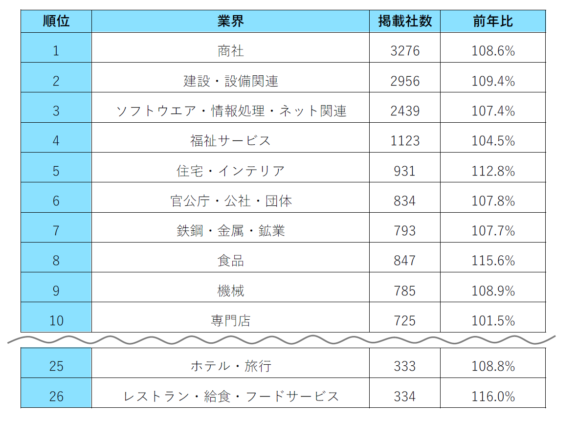 ・業界別に掲載社数を見ると、48業界中のトップ3は「商社」「建設・設備関連」「ソフトウエア・情報処理・ネット関連」となった。そのほか、「ホテル・旅行」の掲載社数は前年比108.8%で25位、「飲食・フードサービス」は前年比116.0%で26位と、前年と順位は変わらないが掲載社数は増加しており、採用意欲が回復しつつあるようだ。【図3】