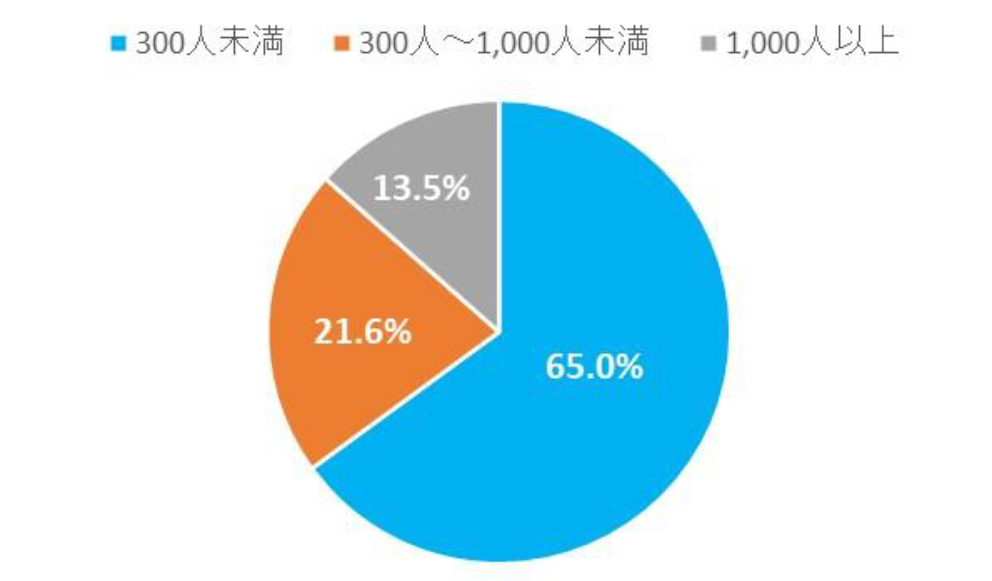 - 企業規模別の掲載社数割合は、「300人未満」が65.0%、「300人~1,000人未満」が21.6%、「1,000人以上」が13.5%【図2】