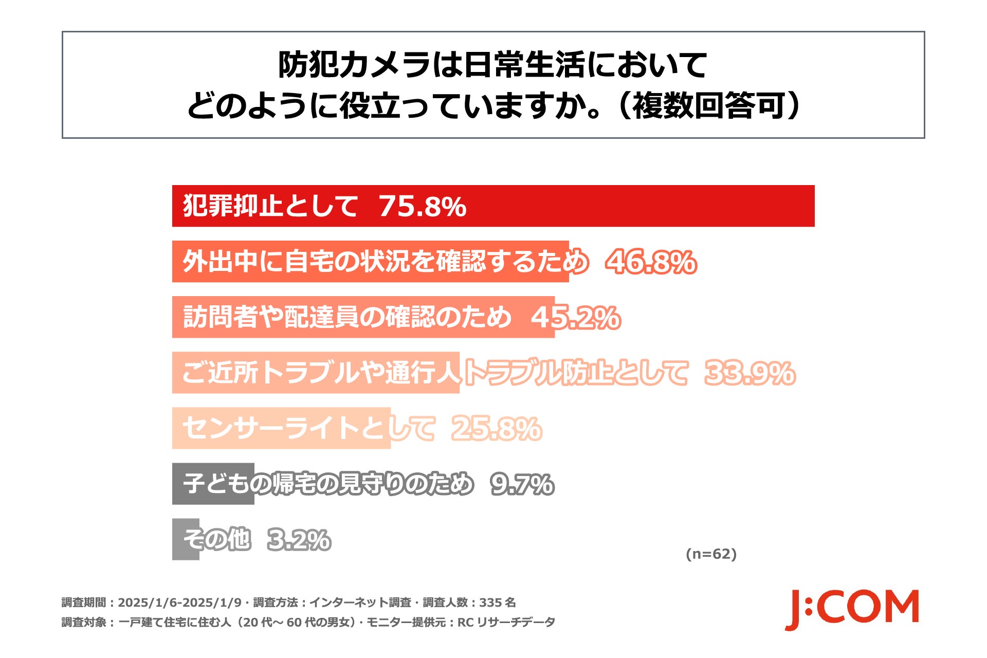 次に、自宅に防犯カメラを設置していると回答された方に「防犯カメラは日常生活においてどのように役立っているか」を尋ねる設問への回答で多かったのは、「犯罪抑止として」で75.8%、次いで「外出中に自宅の状況を確認するため」が46.8%、「訪問者や配達員の確認のため」が45.2%という結果になりました。この結果から、防犯カメラは「犯罪抑止」に最も役立っていると感じている人が多い、ということが明らかになりました。