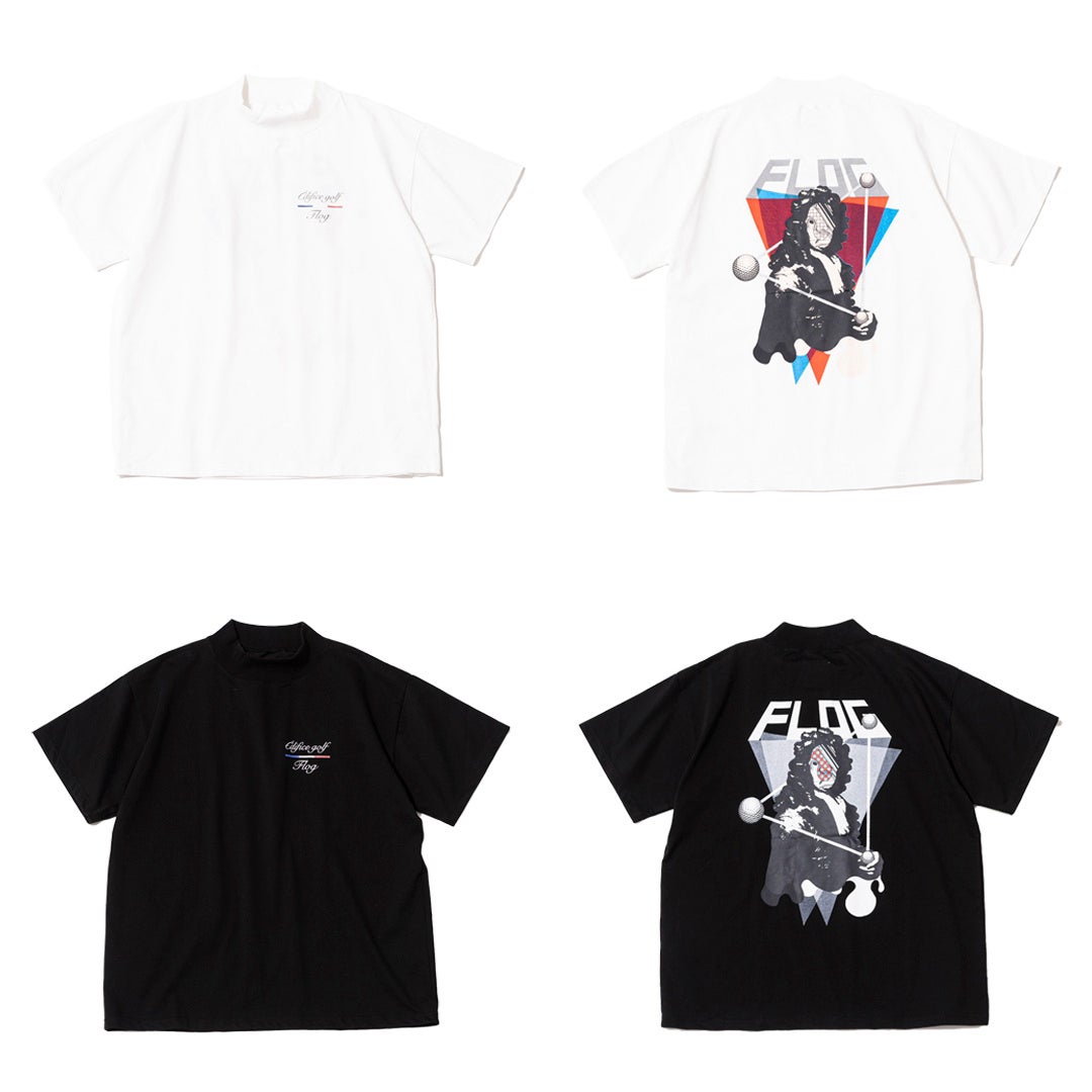 FLOG の定番でもあるオリジナルボディのモックネックシャツをベースに、胸にはコラボロゴを配置し、バックにはシルクスクリーン・アートクルーの Hedonizm との共作であるプリントを⼤胆に配置。彼らならではの世界観にゴルフを落とし込んだ、アートを⽻織るに相応しい⼀枚に。