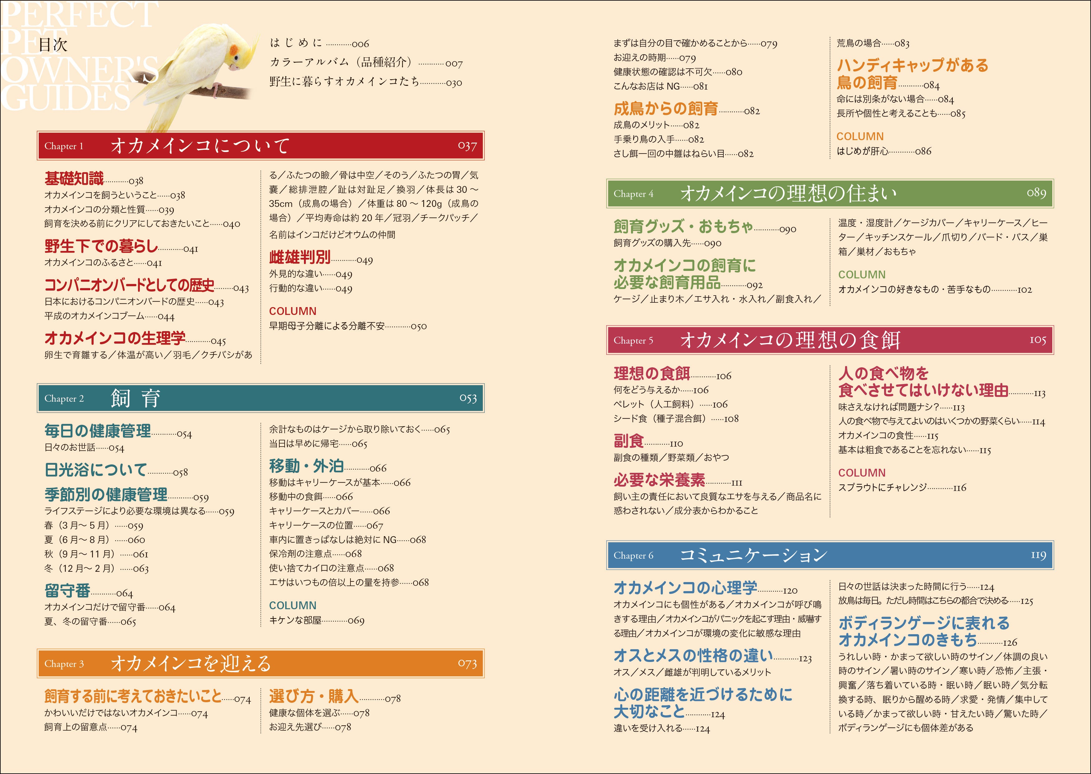基本的な飼育・管理方法をはじめ、色変わりなど種類が多いオカメインコのバリエーション、しつけやコミュニケーションの取り方、ブリーディングの楽しみなど入門者にもわかりやすく解説しています。