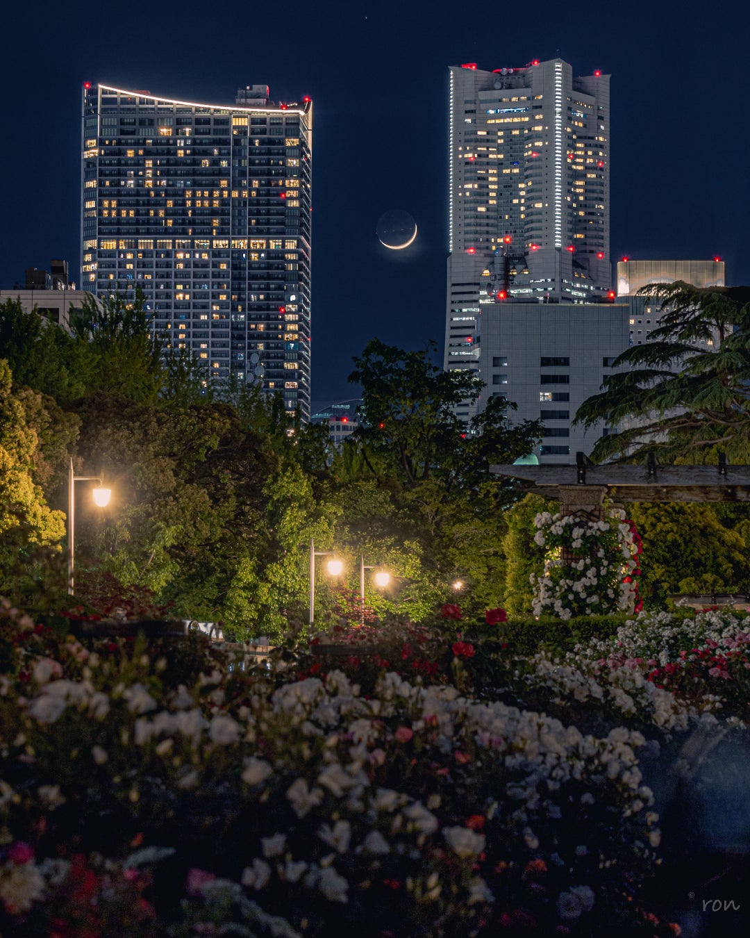 静寂な夜のみなとみらいにランドマークタワーが聳え、高層ビルの隙間から三日月が顔を出している。