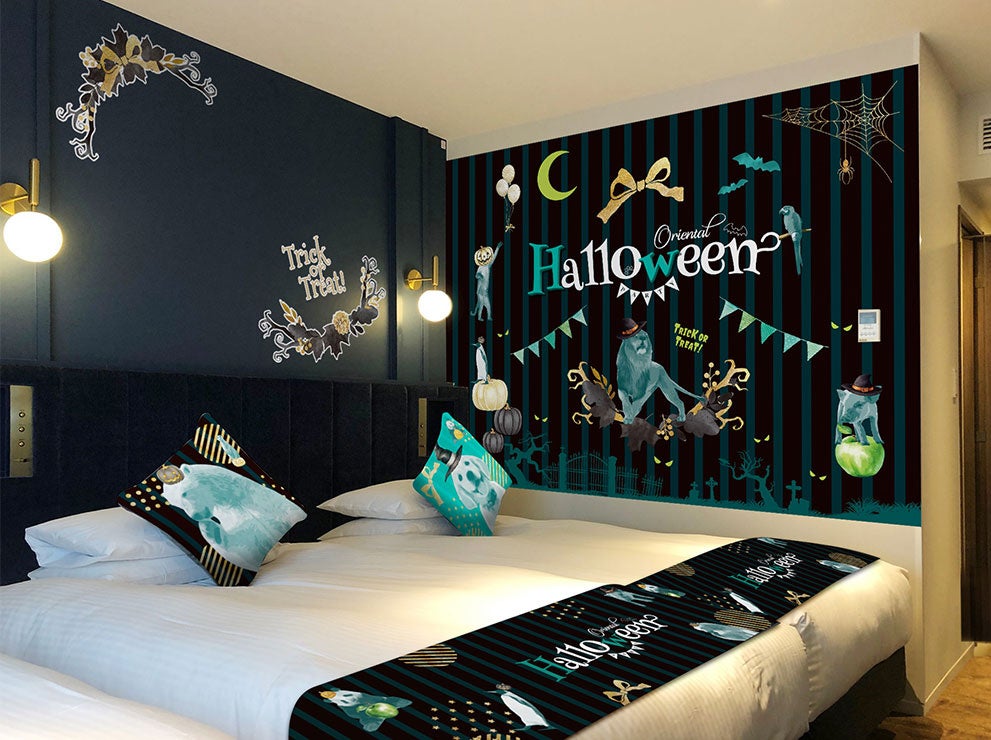 宿泊プランでは、ホテル最上層「The Oriental Floor」の「オリエンタル・デラックス」(42㎡)3室と、「オリエンタル・コンフォート」(25㎡)3室の計6室限定でご用意。仮装した動物たちが集まって繰り広げる楽しく賑やかなパーティーをイメージし、可愛らしいポップなテイストと、ちょっぴり大人可愛いニュアンスの2種類のデザインで展開。