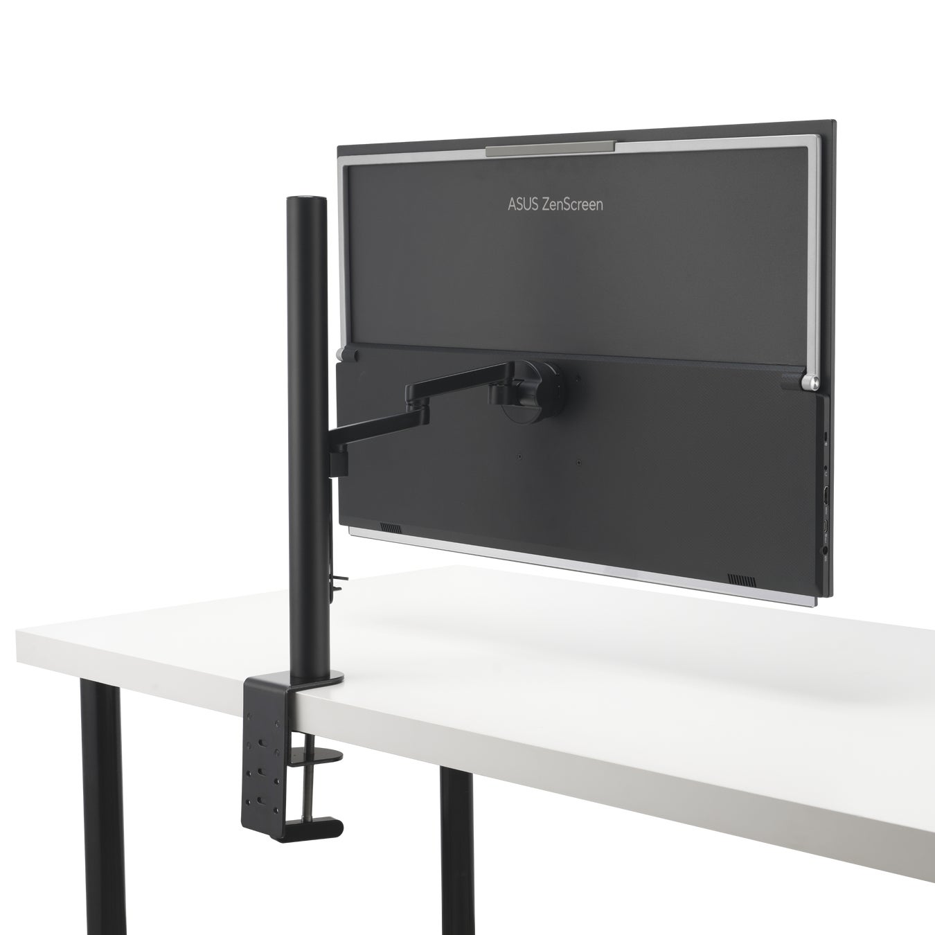 「ASUS ZenScreen MB27ACF」には、モニターをさまざまな角度で支えるキックスタンドを兼ねたキャリーハンドルを搭載しており、快適に視聴することができます。さらに人間工学に基づいたC型クランプアームとパーティション用フックキットも付属。快適な視聴位置を確保するZ軸調整のアームや、さまざまな配置に対応するフックキットで机上のスペースを最大限に活用できるので、限られたスペースへの設置にも最適です。