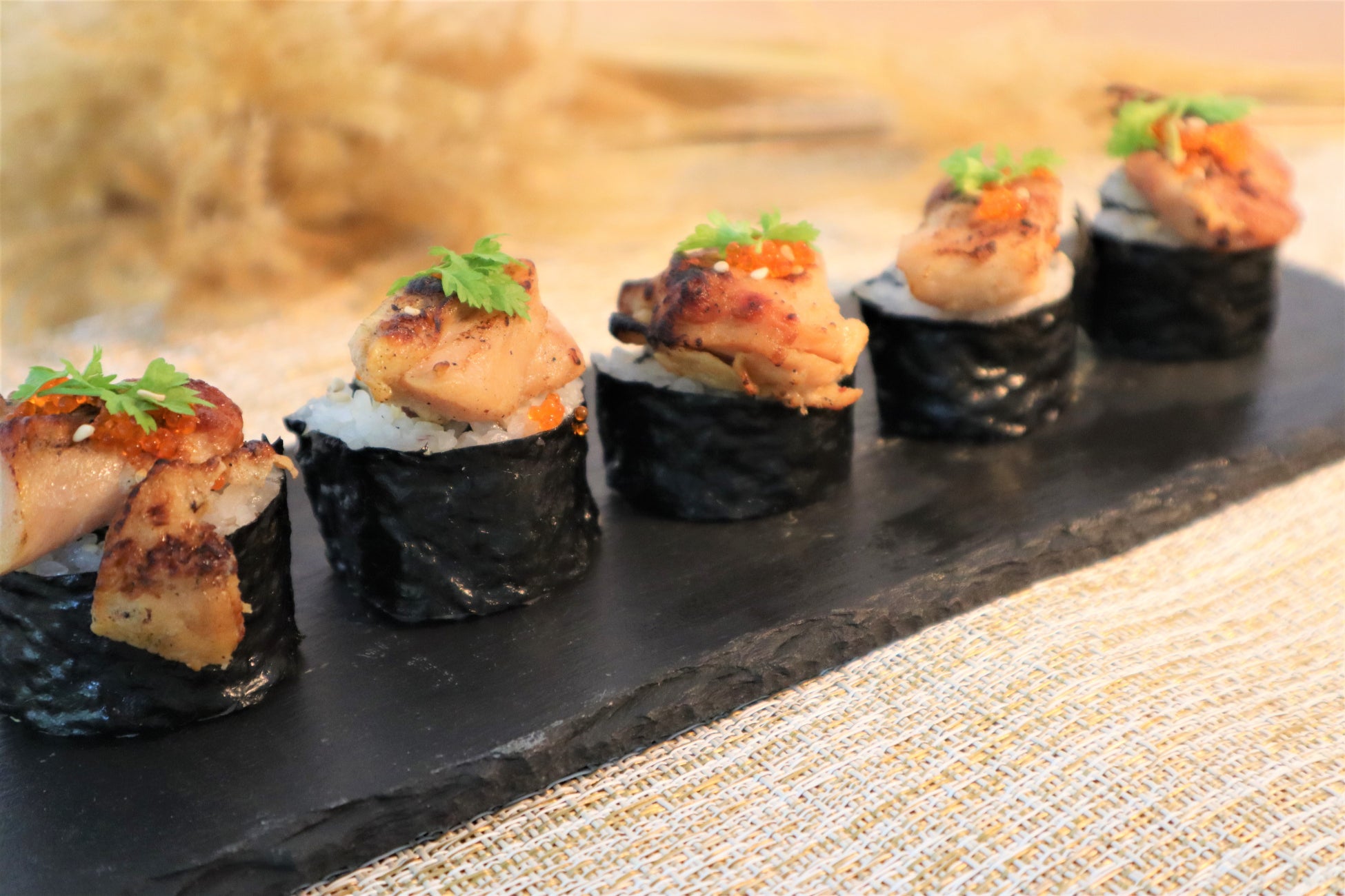 みょうがや大葉の巻きずしの上に「心斎橋のはちみつ」を使用して照り焼きにされたチキンがドンと乗っています。薬味とチキンが絶妙にマッチ。とびこのプチプチ感もアクセントです。