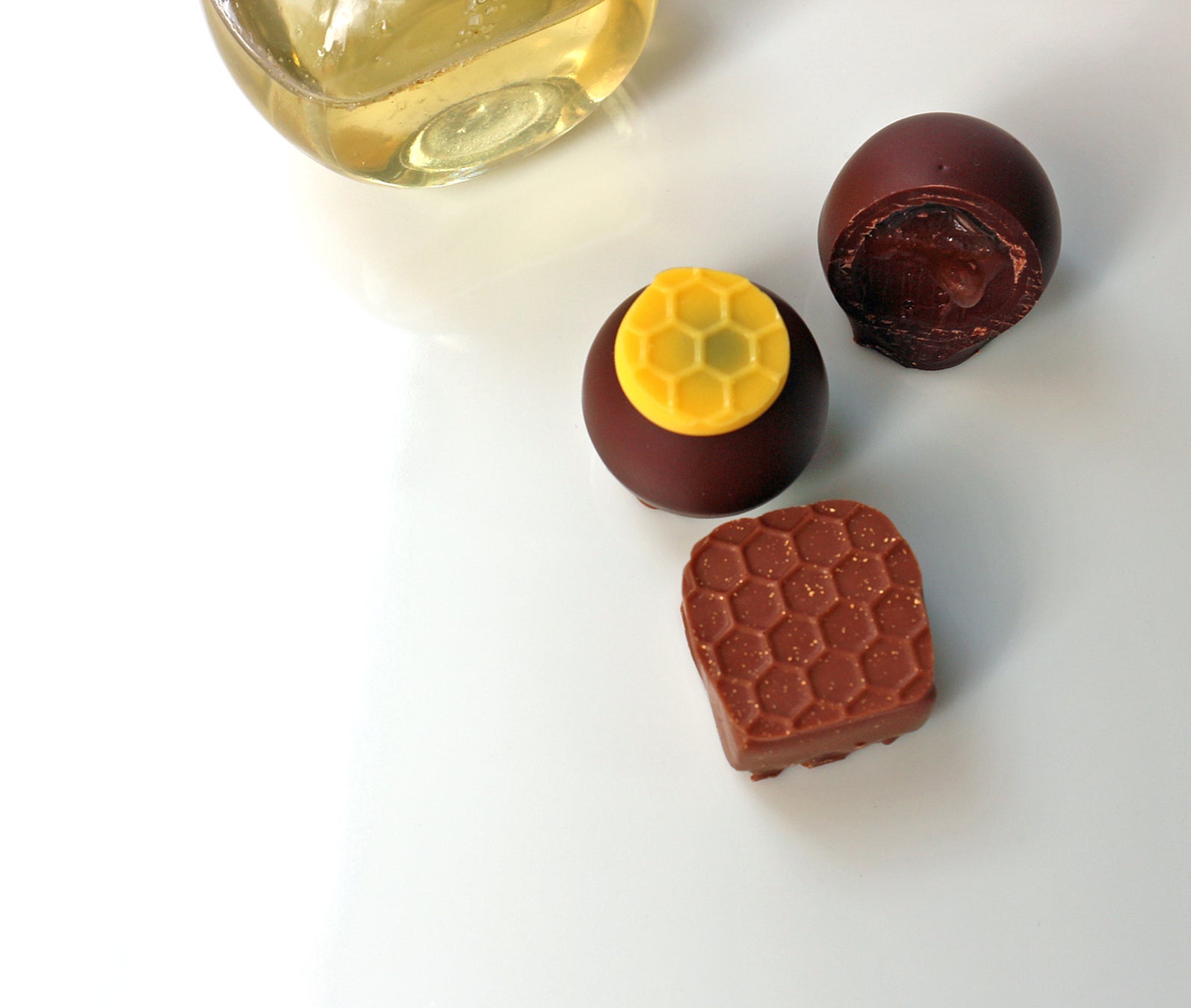写真中央)丸いチョコレートのセンターに「心斎橋のはちみつ」を閉じ込め、中からとろ~りとはちみつが口の中に広がります。