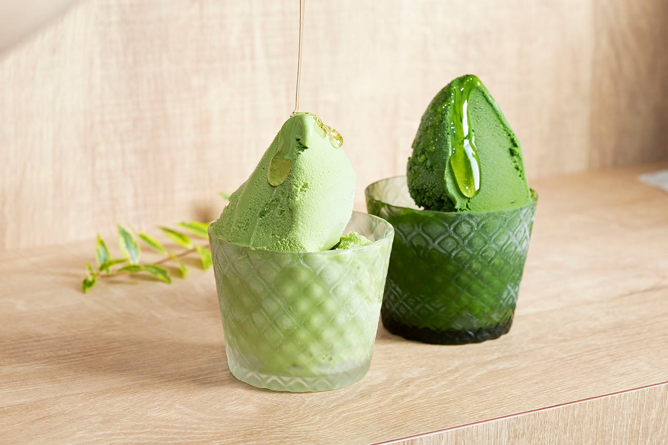 お茶の専門店〈伊藤園〉のほろ苦い抹茶ジェラートと芳醇な「心斎橋のはちみつ」のマリアージュが絶妙です。