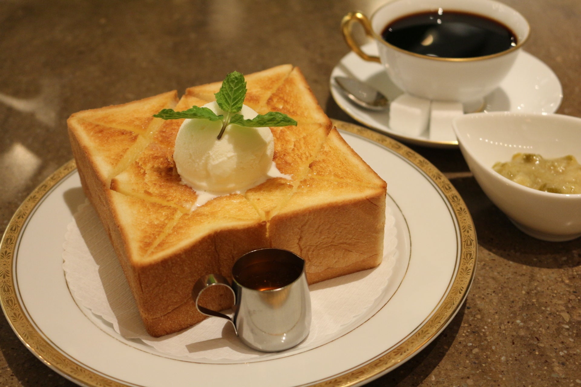 焼きたてワッフルに「フランス政府AOP認証バター」を 添えて。濃厚な甘みを感じる「心斎橋のはちみつ」とともにお召しあがりください。