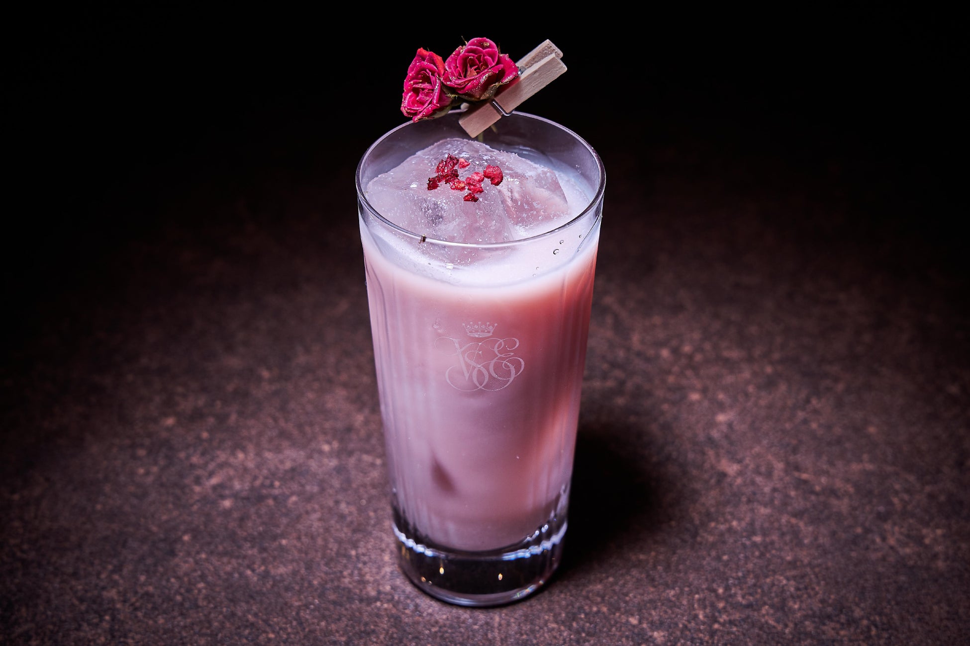 パリで誕生した「イスパハン」をイメージしたカクテルです。まるでピンクの宝石のようなこのデザートは、マカロン生地にライチやベリーにバラの風味を加えたクリームをサンドしたもの。クリーミーで甘美な味わいをカクテルで再現しました。