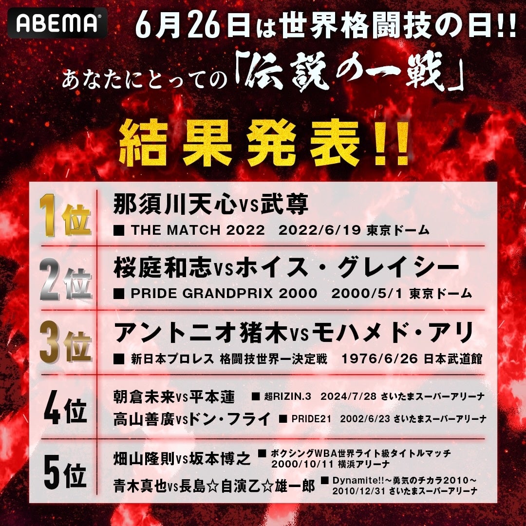 ABEMA格闘公式Xでは、6月26日の『世界格闘技の日』にちなんで、「格オタの皆さん!あなたの思う“伝説の一戦”を教えてください」と投稿し、多くの格闘技ファンから格闘技に対するアツいコメントとともに回答が寄せられました。本日、6月26日(木)午前9時には結果を発表し、以下の名勝負が選出されました。