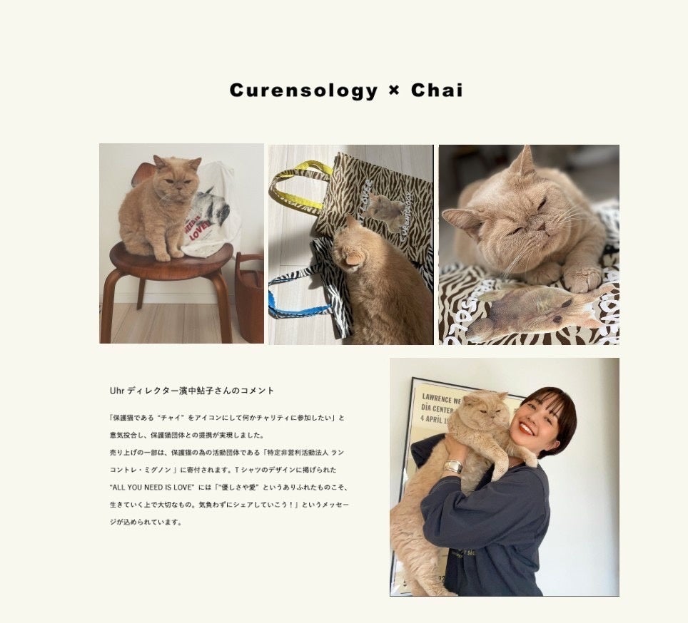 Curensologyと親睦の深いUhrのディレクター濱中鮎子氏とタッグを組み、チャーミングな愛猫『チャイ』を主役にしたTシャツとトートバッグが完成しました。