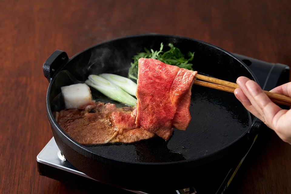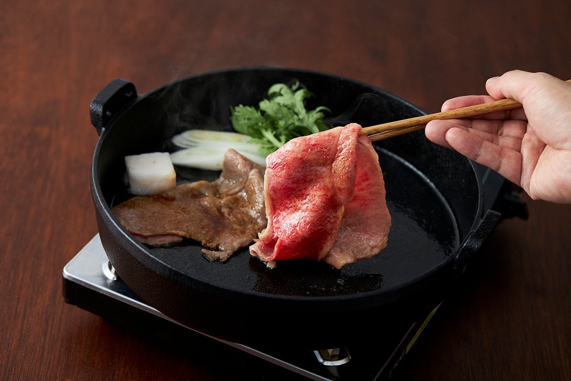 ご注文をいただいてから焼きすき用の鉄板をご用意して、お客様の目の前で焼き上げます。熱々の鉄板の上に〈粉黒糖〉と〈湯浅醤油〉の香ばしい香りが広がり、更に、焼きたてのお肉の香りが混ざった香りは食欲を掻き立てられます。宮城県から取り寄せた〈竹鶏たまご〉の黄身に絡めてお召し上がりください。