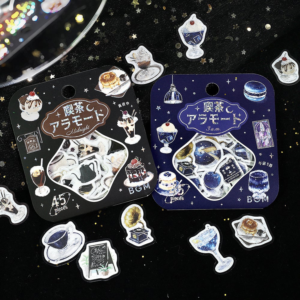 喫茶店をモチーフにした人気のフレークシールから、「真夜中」「午前3時」の柄が新登場。