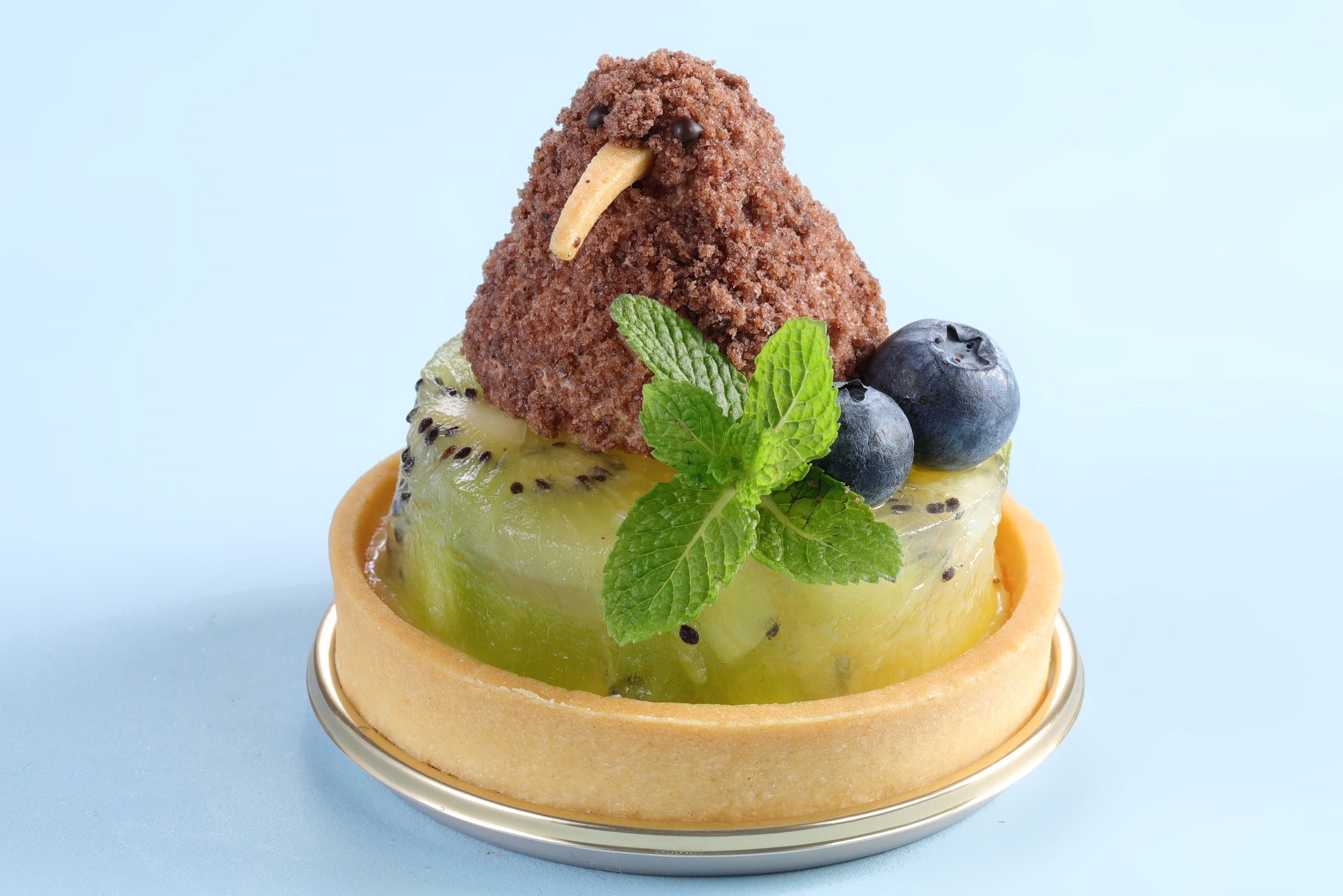 香ばしいタルト生地にバニラムースとキウイフルーツのゼリー、ニュージーランドの国鳥「キーウィ」に見立てたムースをトッピングしました。旬のブルーベリーとキウイフルーツの酸味がさわやかな、夏におすすめのタルトです。