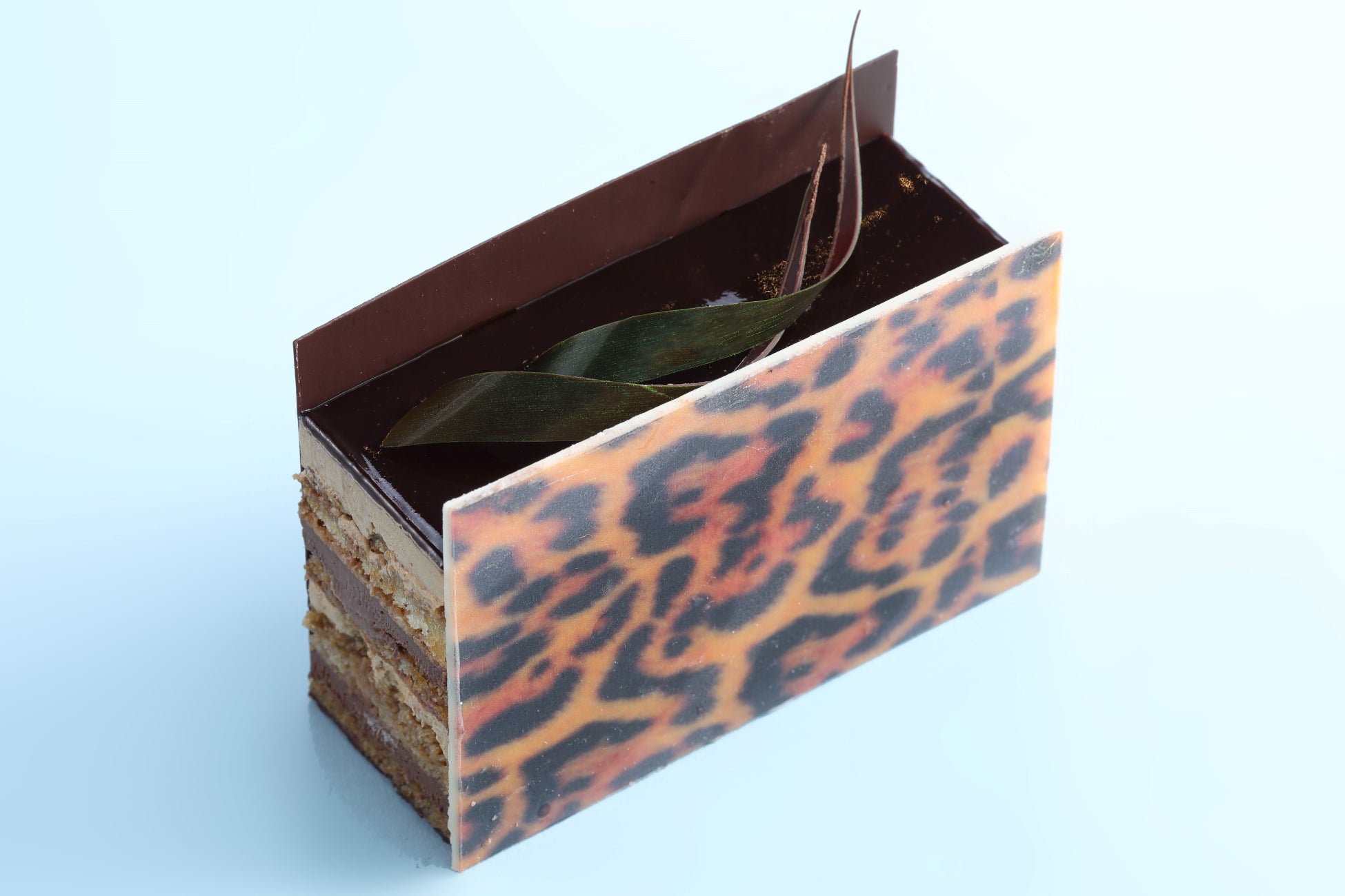 チョコレートケーキの定番「ガトー・オペラ」をジャガー柄のチョコレートでサンドしました。チョコレートの柄は両サイド異なり、片方はジャガーのロンくん、もう片方は小春ちゃんをイメージしています。
