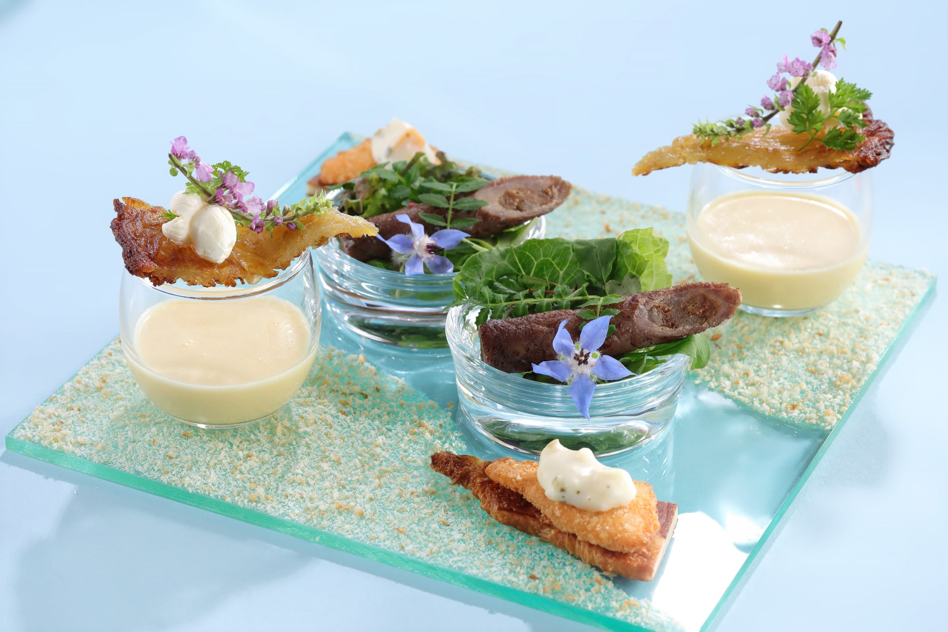ッサンとサーモンのフライ / 冷製コーンスープとじゃがいものガレット
