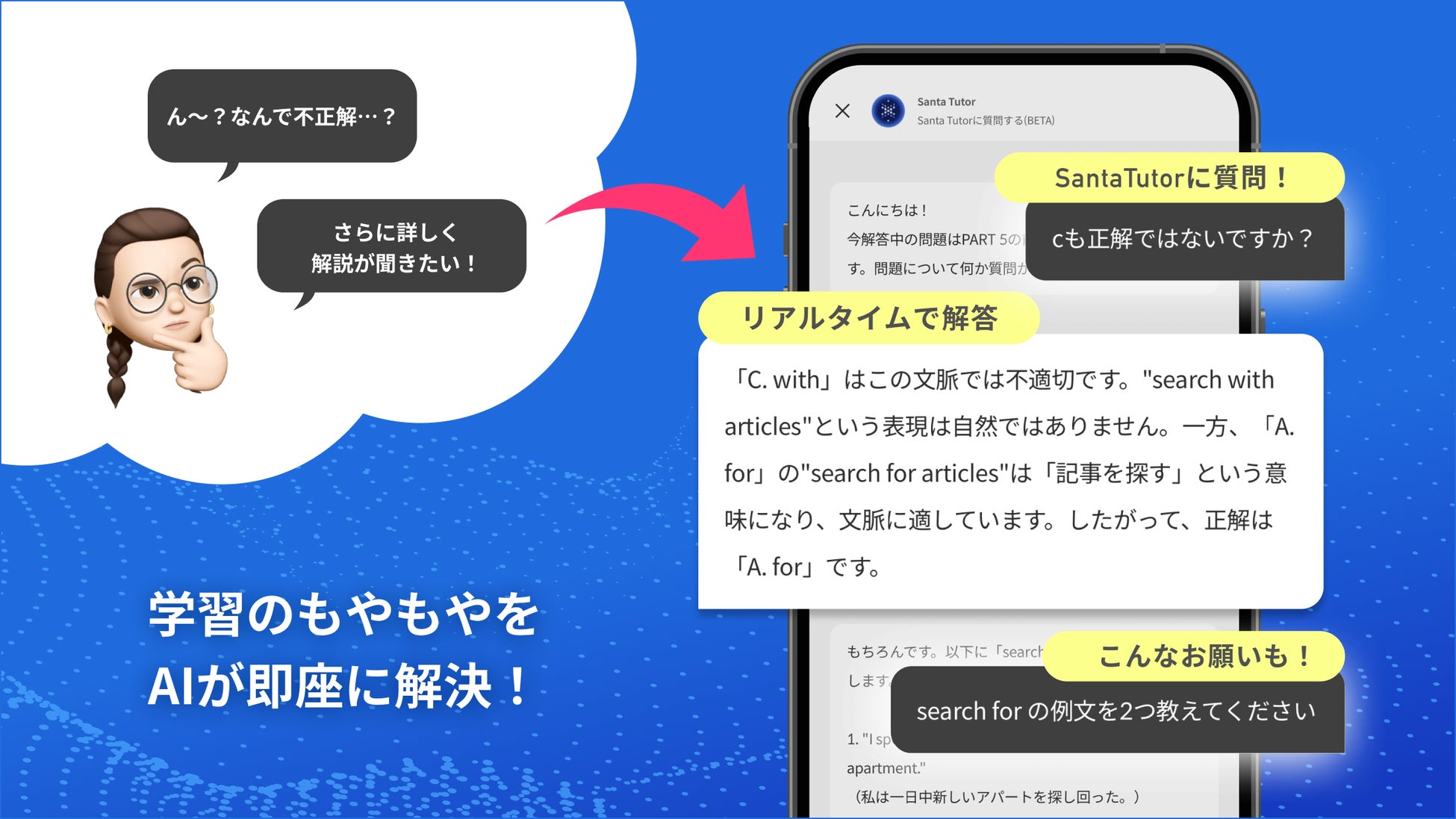 Santa Tutorは、アプリ内で出題された「問題」「答え」「解説」に関するユーザーの質問に対してAIがリアルタイムで回答する機能です。学習中に生じる「ふとした疑問」について気軽に質問できるため、スムーズな学習をサポートします。