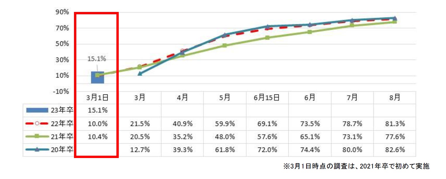 - 2023年卒業予定の大学生・大学院生の内々定率(3月1日~3日時点)は15.1%、平均内々定保有社数は1.5社。多くの学生はこれから就職活動を本格的にスタート【図1、2、3】