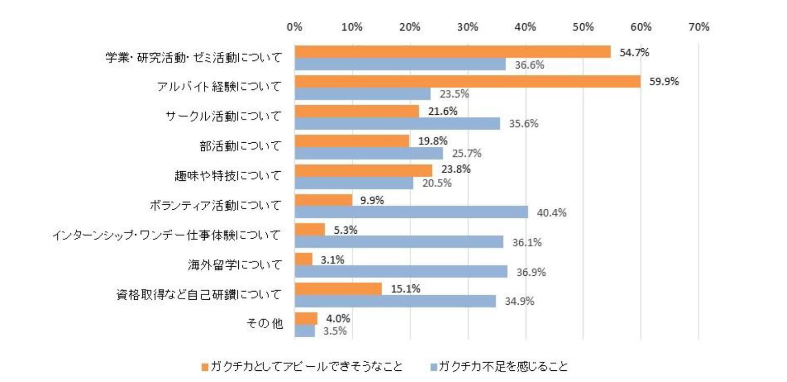 - ガクチカとしてアピールできそうなポイントは「アルバイト」「学業」が上位。エピソードとして不足を感じることは「ボランティア活動」「海外留学」など【図5】