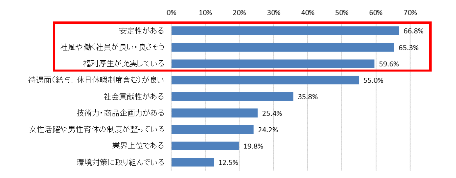 「就職先として企業を選ぶ際のポイント」を聞いたところ、最も多かった回答は「安定性がある」で66.8%だった。「社風や働く社員が良い・良さそう」や「福利厚生が充実している」、「待遇面(給与、休日休暇制度含む)が良い」の割合も過半数を超えた。社風や社員の雰囲気などのソフト面、福利厚生・待遇などのハード面の両方で、就職先が安心して働くことができる環境かどうかを重要視しているようだ。【図4】
