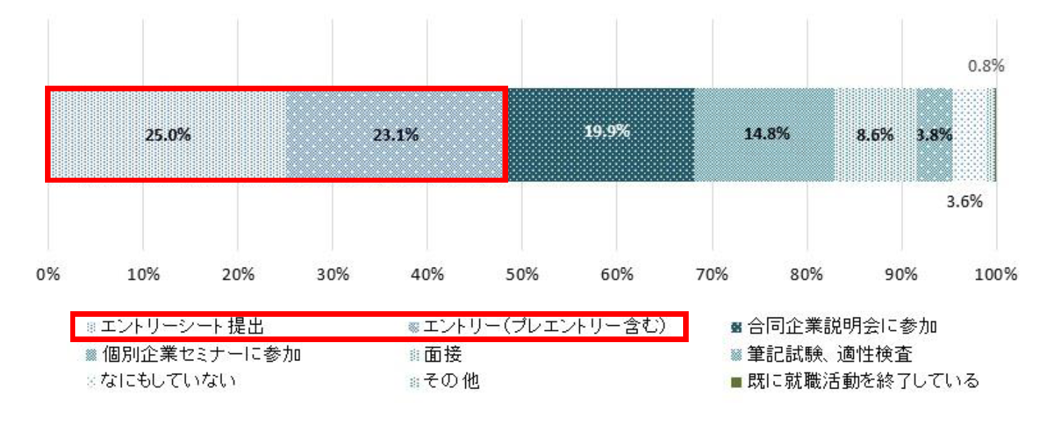 内々定率は前年比5.1pt増の15.1%となりました。インターンシップ・ワンデー仕事体験への参加率も高く、学生が就職活動開始前から準備を進めていることに加え、企業側の採用意欲も高まり広報活動開始と同時に選考・内々定出しを行う企業が多いことが要因と考えられます。しかし、8割以上の学生は現時点でエントリーやエントリーシート提出などに注力しており、3月から就職活動を本格的にスタートさせています。学生の皆さんには周囲の進捗を意識することなく、自身の就職活動の軸を大切にし、焦らず活動してほしいと思います。